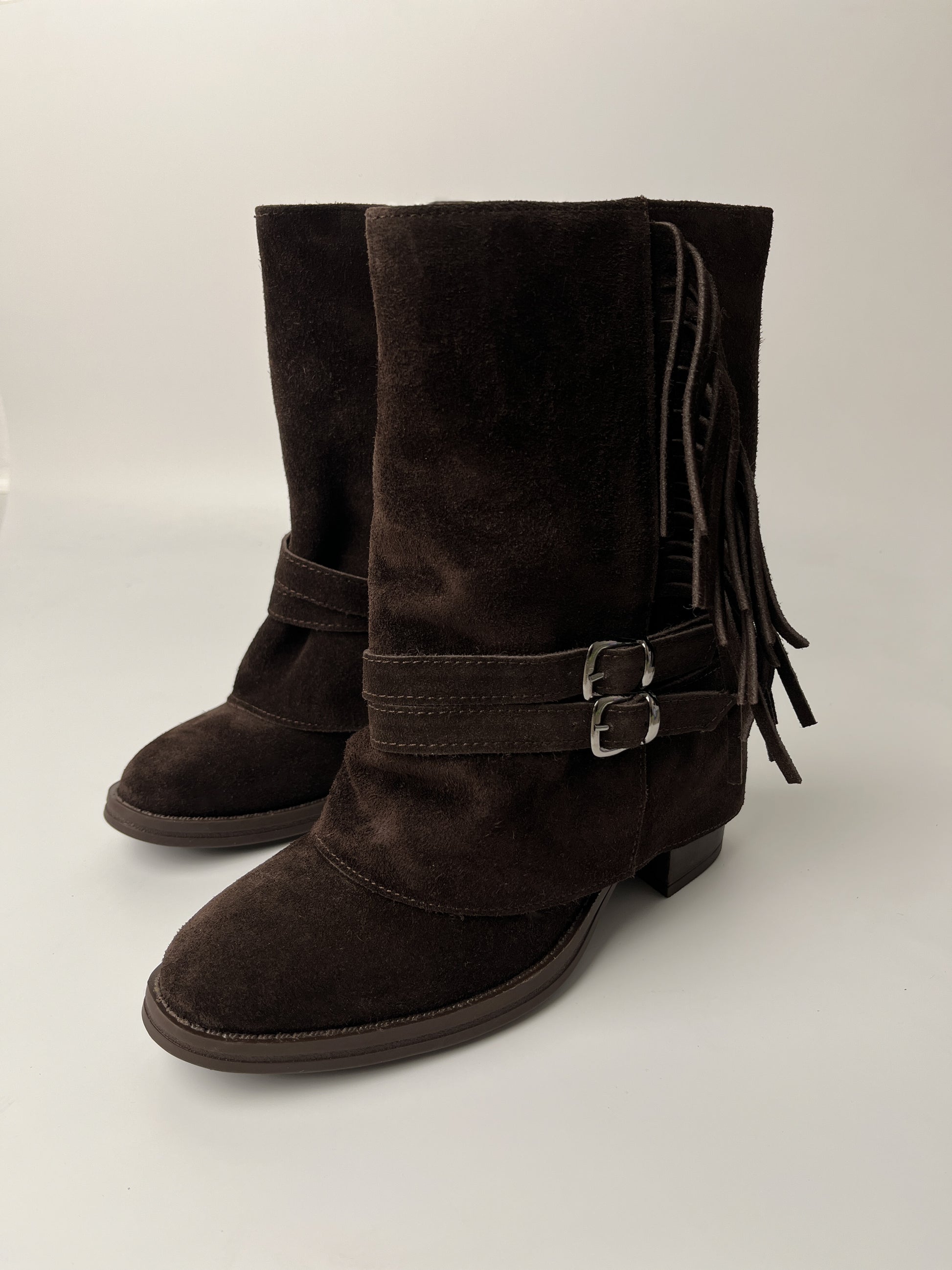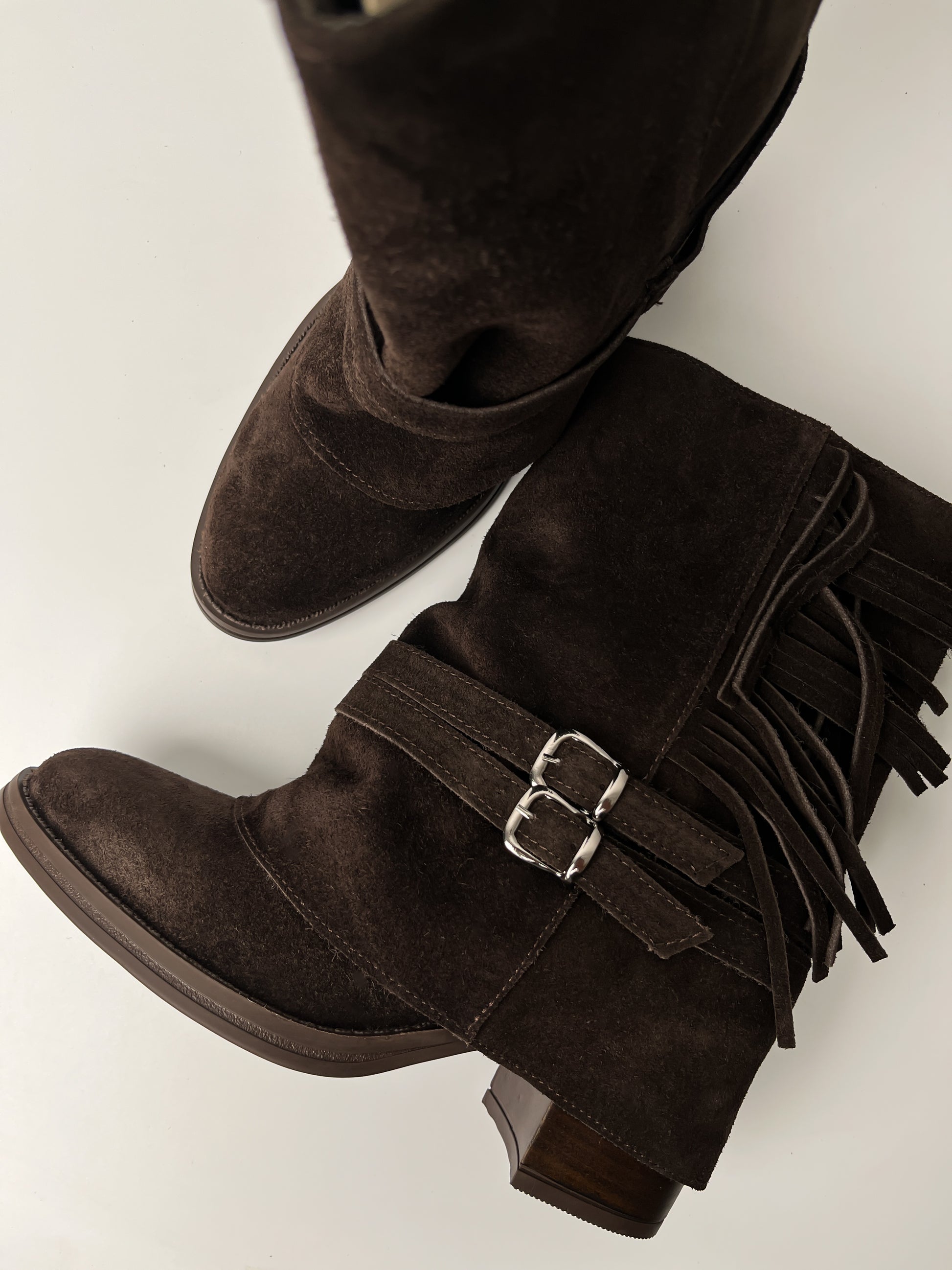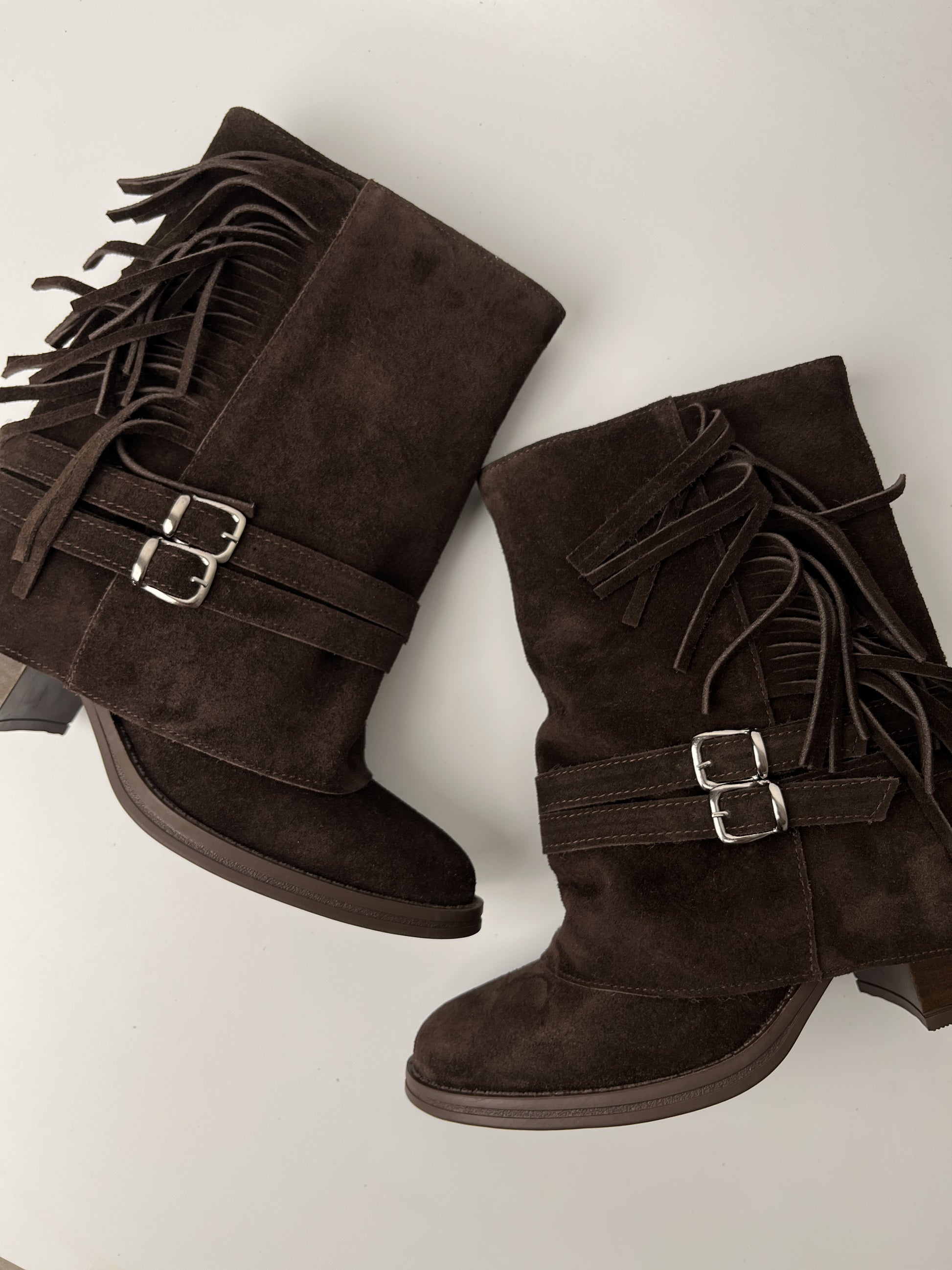 Acı kahvenin sıcak tonu ile western stilini bir araya getiren bu hakiki deri bot, güçlü ve karakterli bir görünüm sunuyor. Yumuşak dokulu hakiki deri yüzey, yan kısımdaki püsküller ve çift toka detayı ile hem modern hem de bohem bir tarz oluşturur.