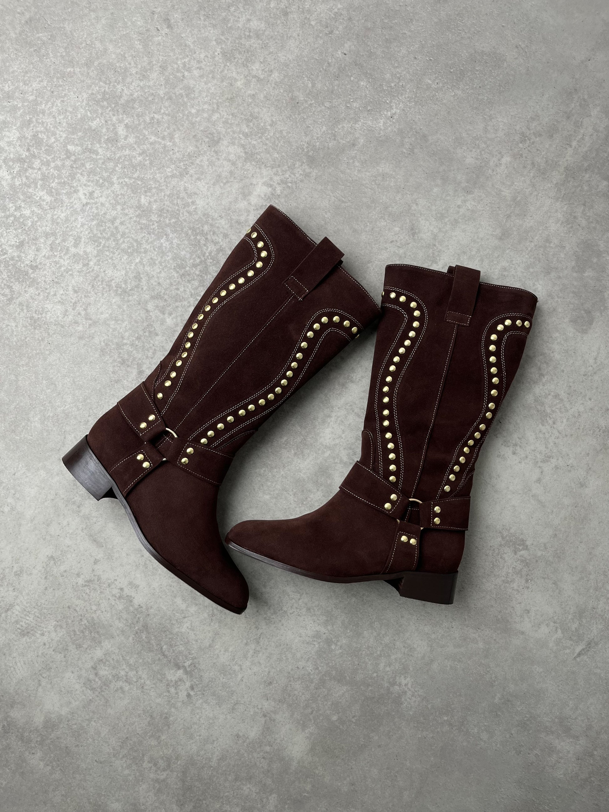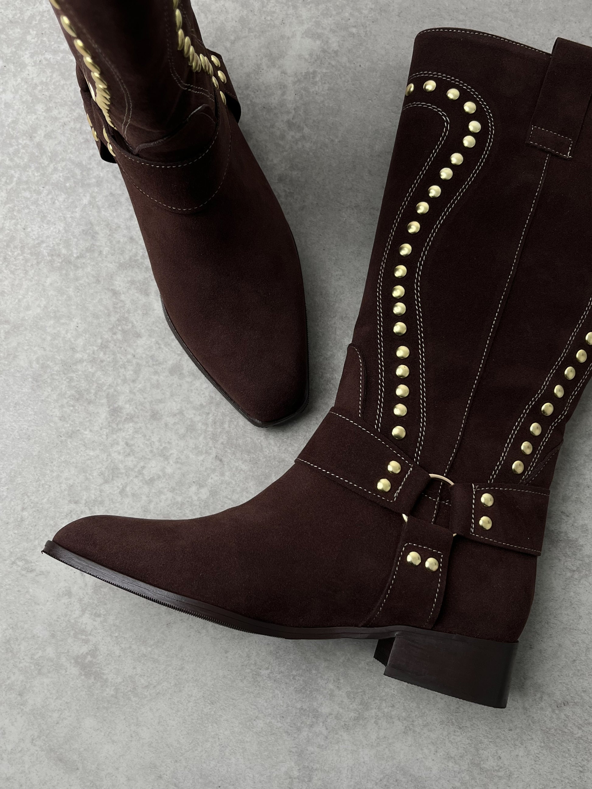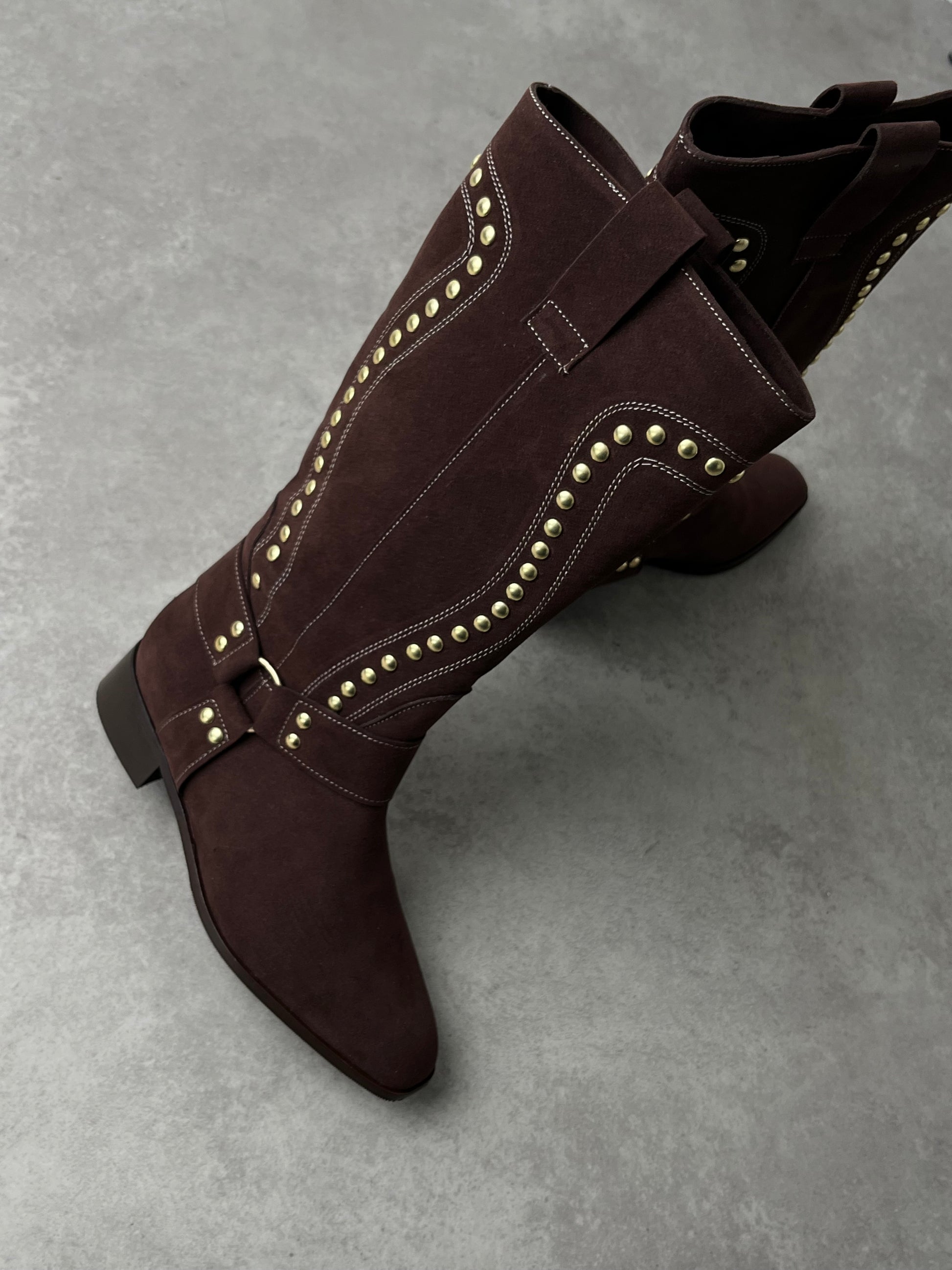 Yumuşak dokulu süet yüzeyi, batı stilini modern çizgilerle buluşturan altın renk trok detayları ve zarif dikiş hatlarıyla özel olarak tasarlanan bu çizme; hem günlük kombinlerde hem de iddialı kış stillerinde mükemmel görünüm sağlar. Bilek kısmındaki kayış tasarımı çizmenin formunu güçlendirirken, rahat kalıbı gün boyu konfor sunar.