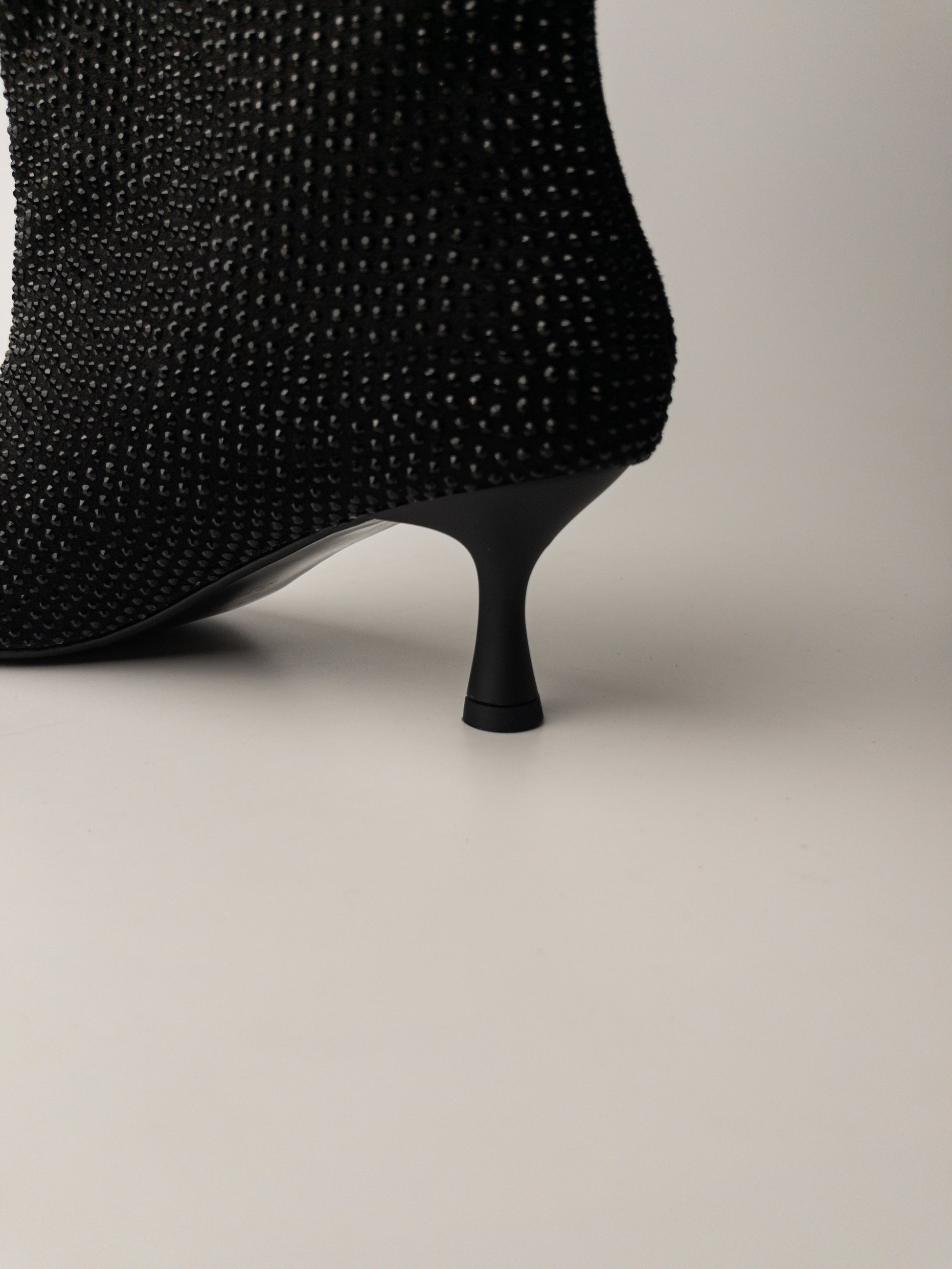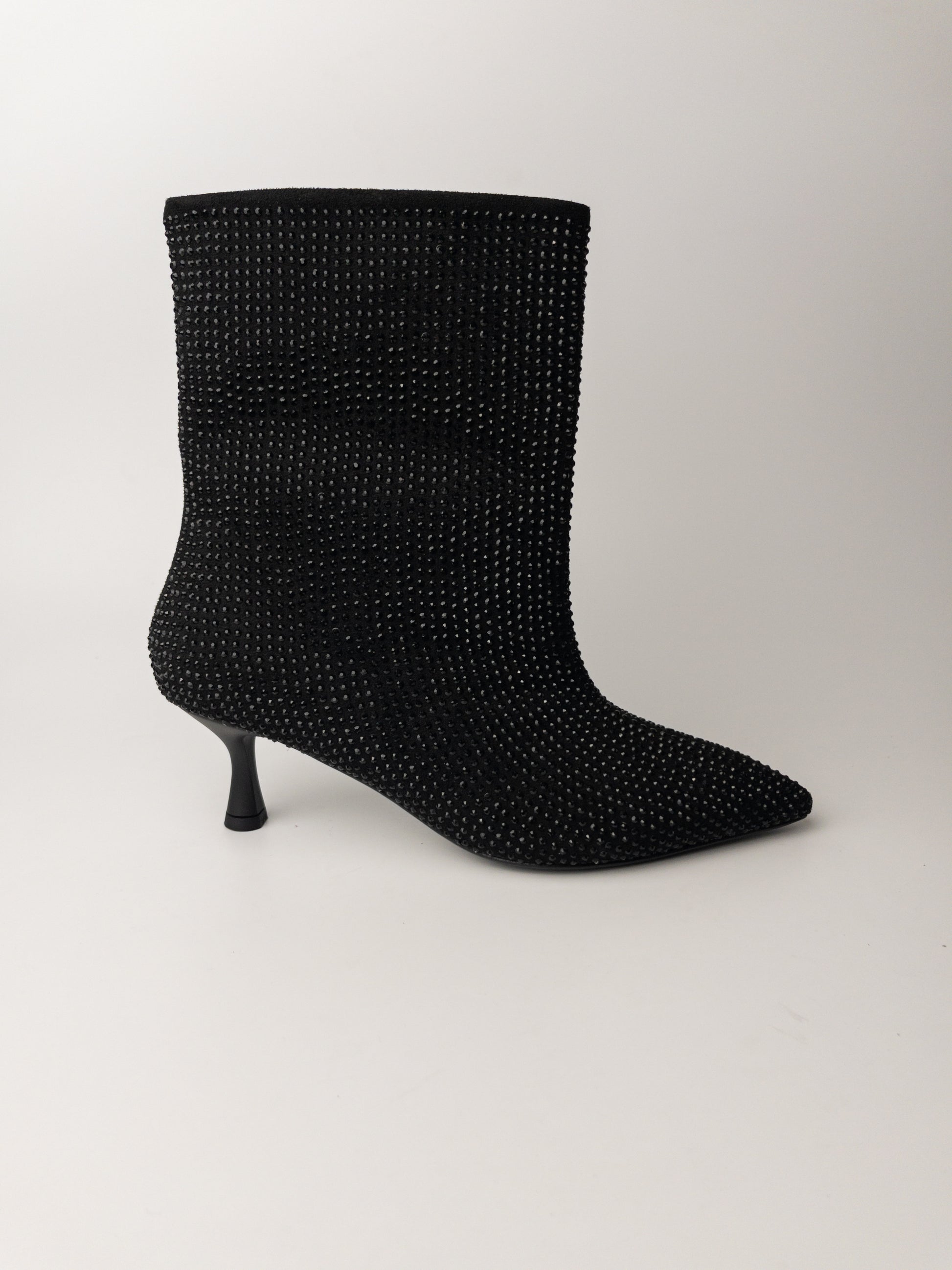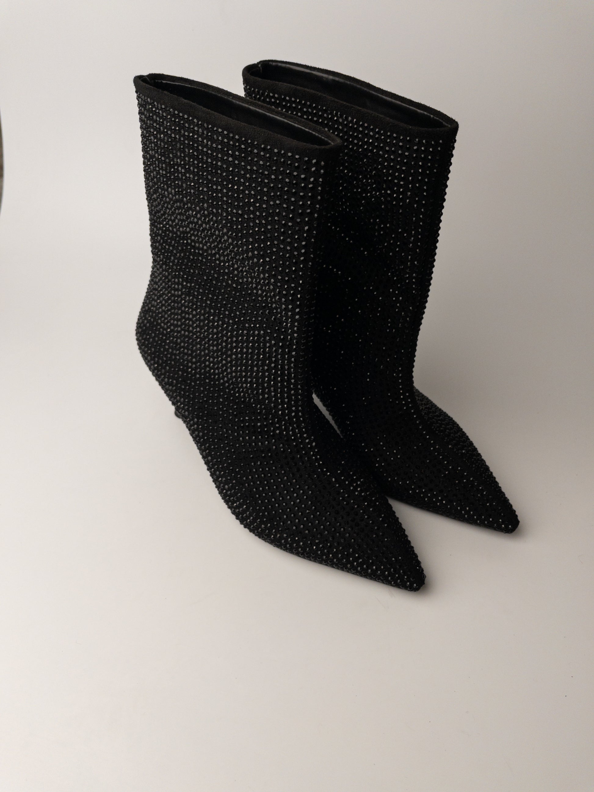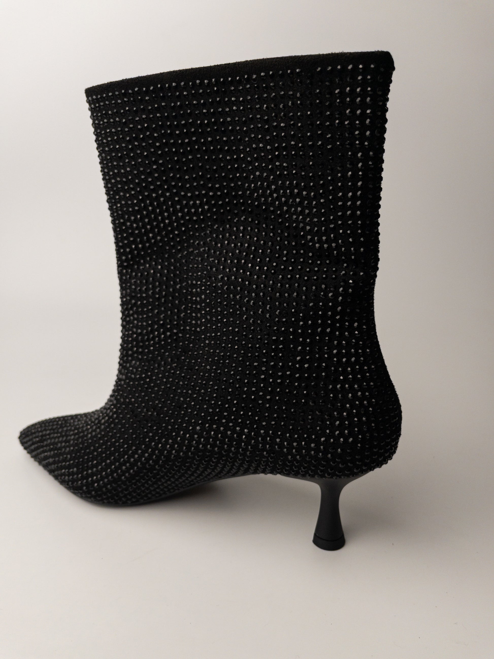 Işıltılı taş detaylarıyla zarif bir görünüm sunan bu siyah bot, hem özel günlerde hem de şık günlük kombinlerde göz alıcı bir stil yaratır. İnce ve kavisli topuğu sayesinde feminen bir duruş sağlar ve 6 cm topuk yüksekliği gün boyu rahat yürüyüş sunar.