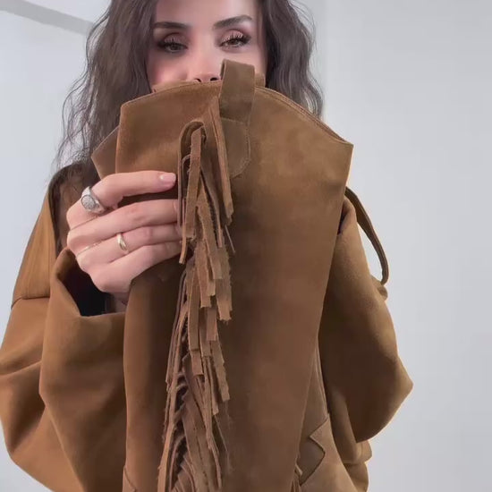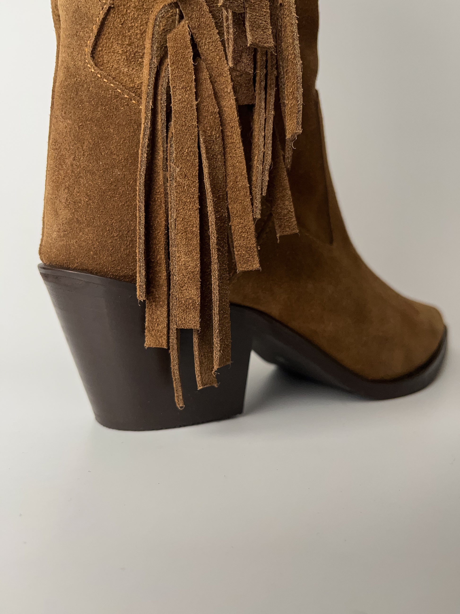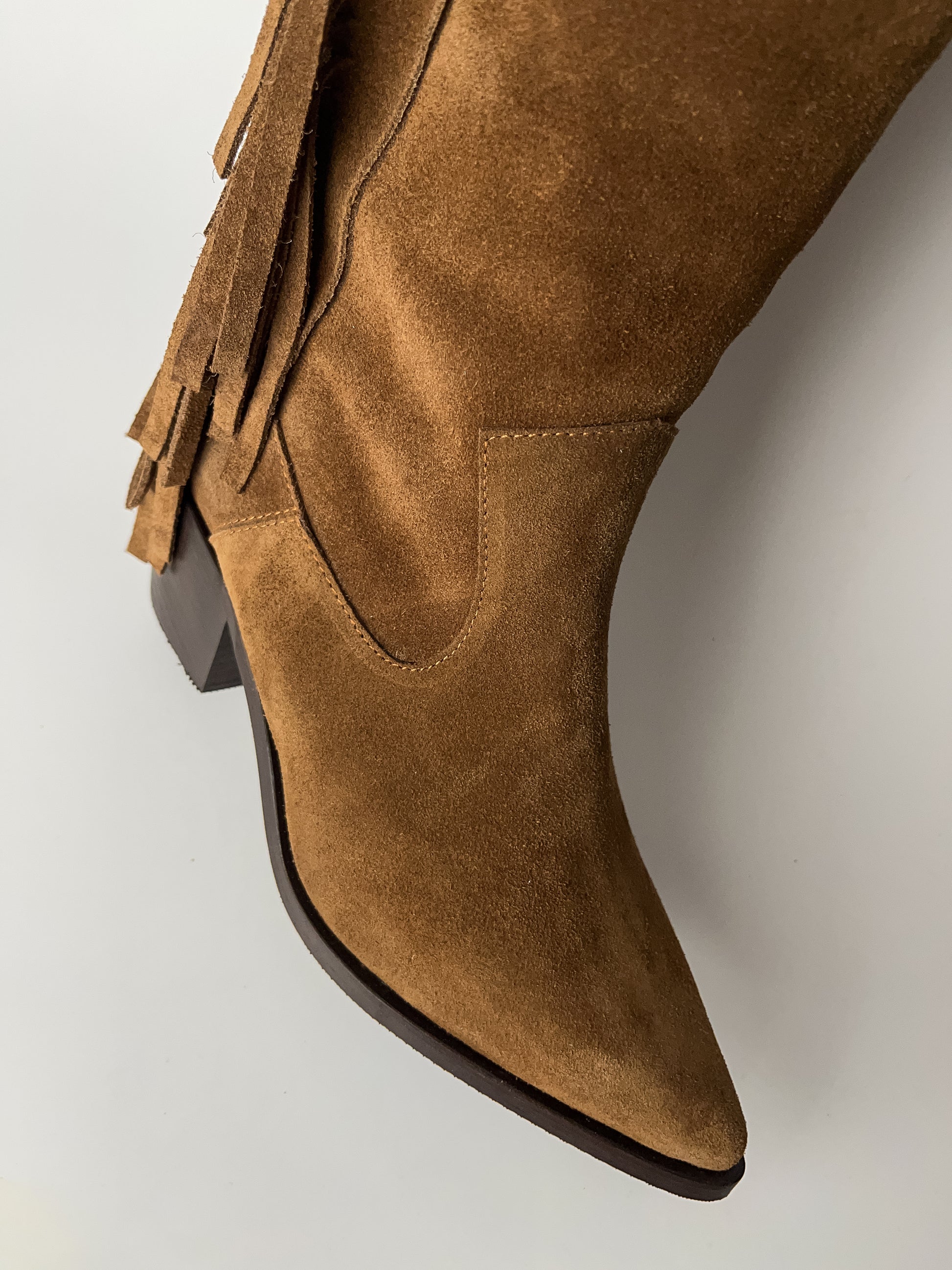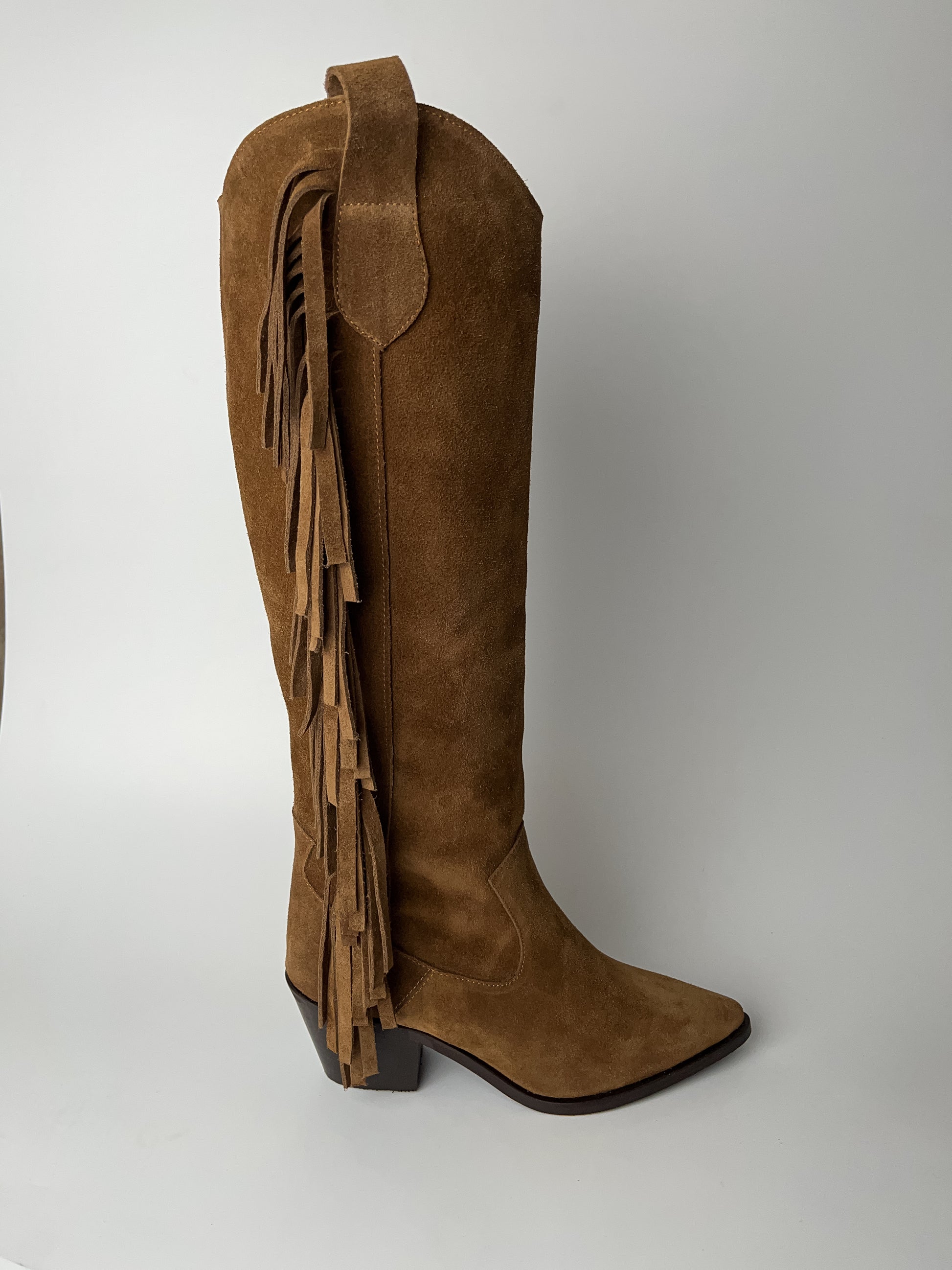 Western stilinin zarafetini modern bir çizgide sunan bu özel model, tamamen hakiki deri süet yüzeyi ve yan bölümdeki hareketli püskül detaylarıyla güçlü bir duruş sergiler. Uzun formu bacağı daha ince gösterirken, dengeli topuk yüksekliği gün boyu konfor sağlar. Sivri burun tasarımı modeli daha feminen ve şık bir çizgiye taşır. Hem günlük kullanıma hem de iddialı kış kombinlerine mükemmel uyum sağlar.