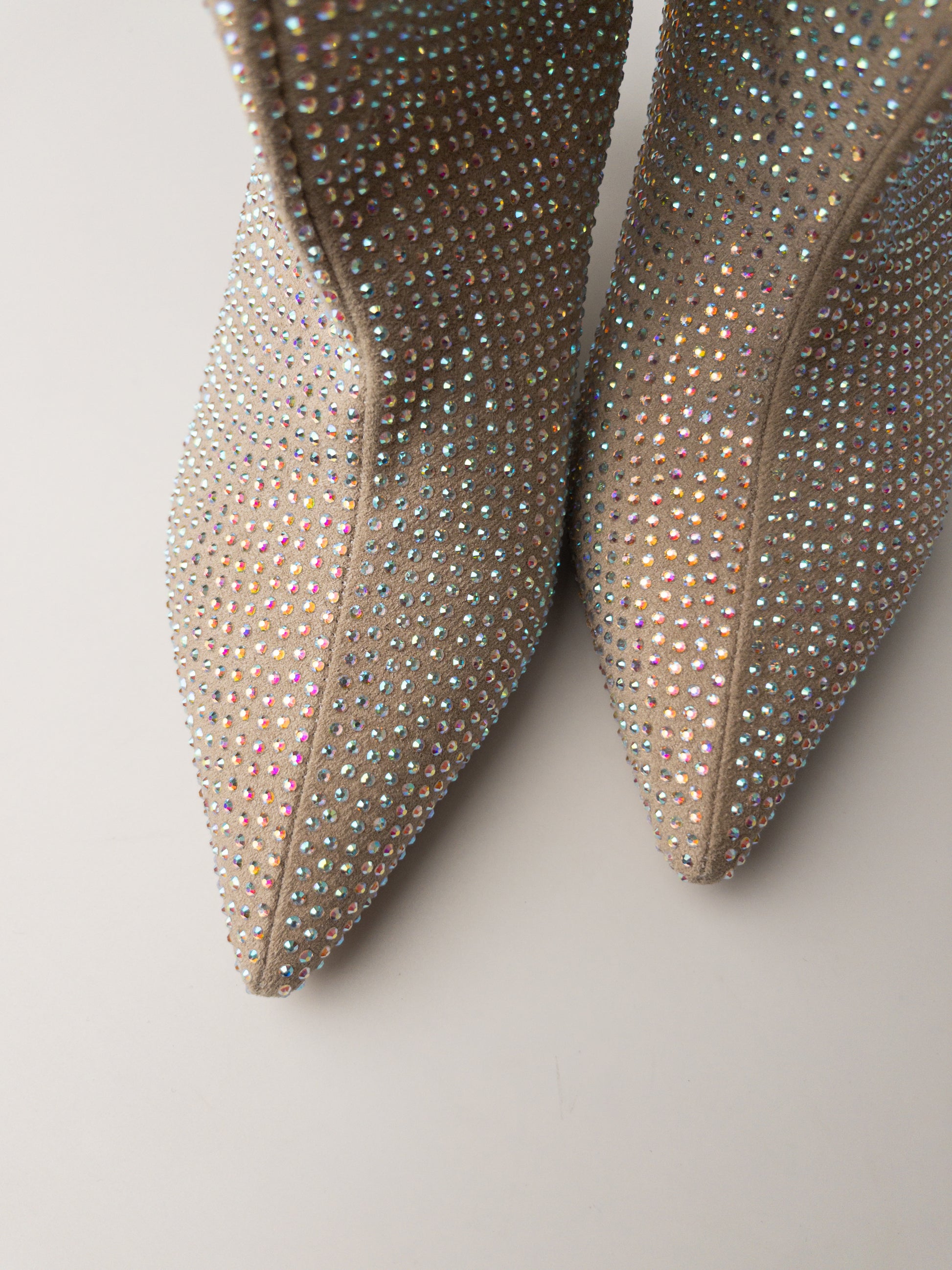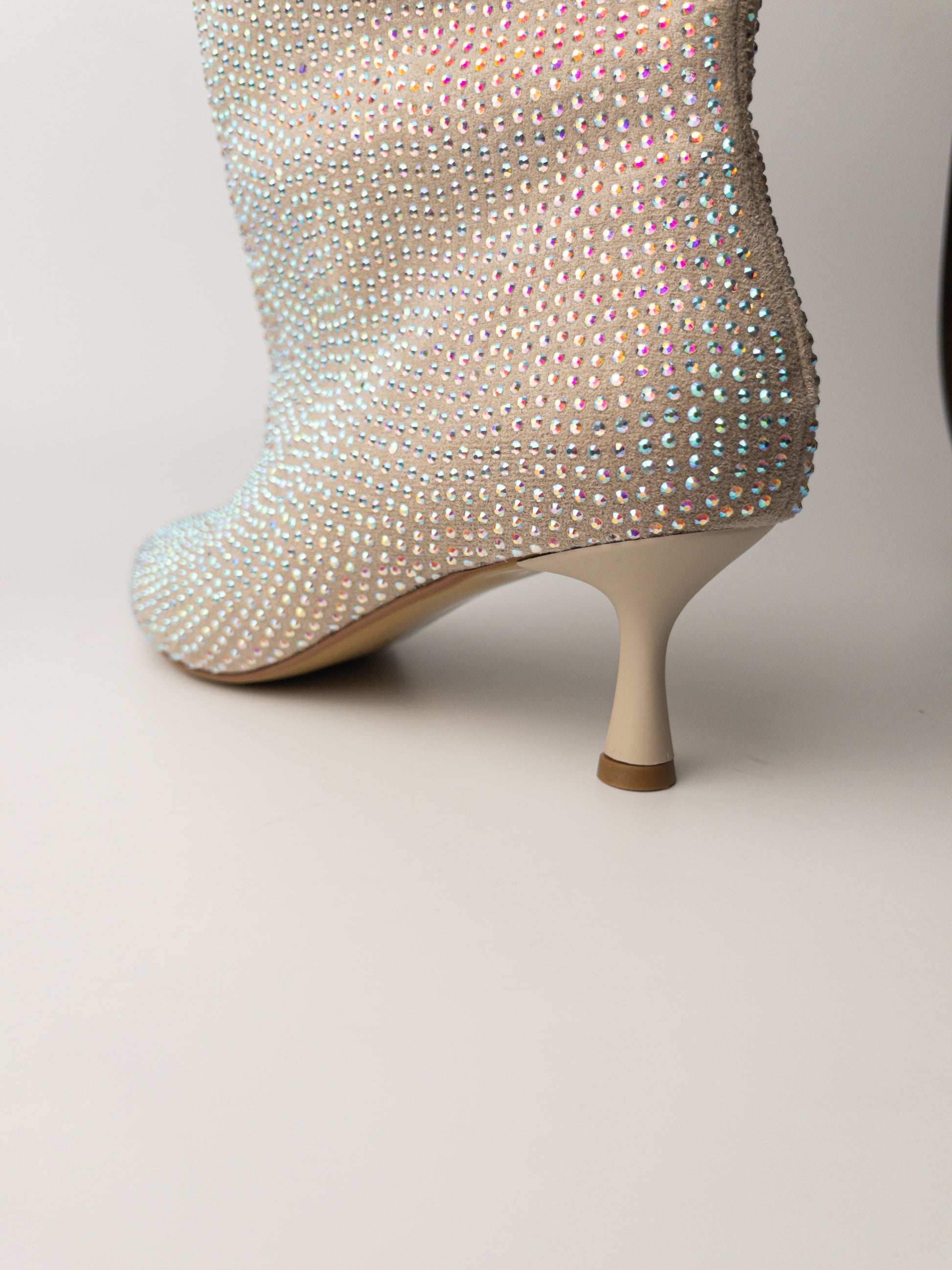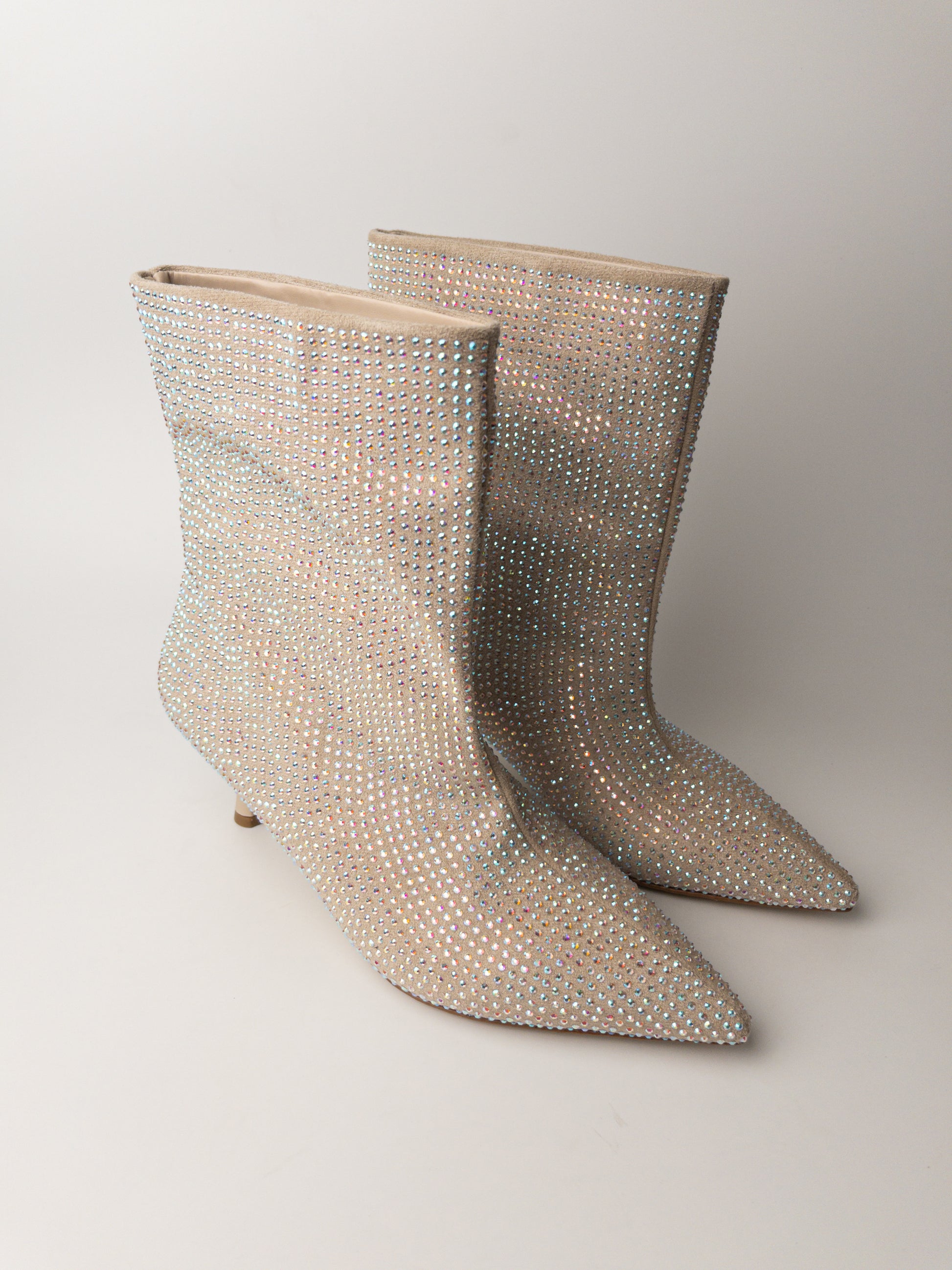 Işıltısıyla göz kamaştıran bu bej taş detaylı bot, özel günlerden davet kombinlerine kadar her stile zarafet katan gösterişli bir modeldir. Üzerindeki mikro taş işlemeler, ışığı her açıdan yansıtarak şık ve dikkat çekici bir görünüm oluşturur.