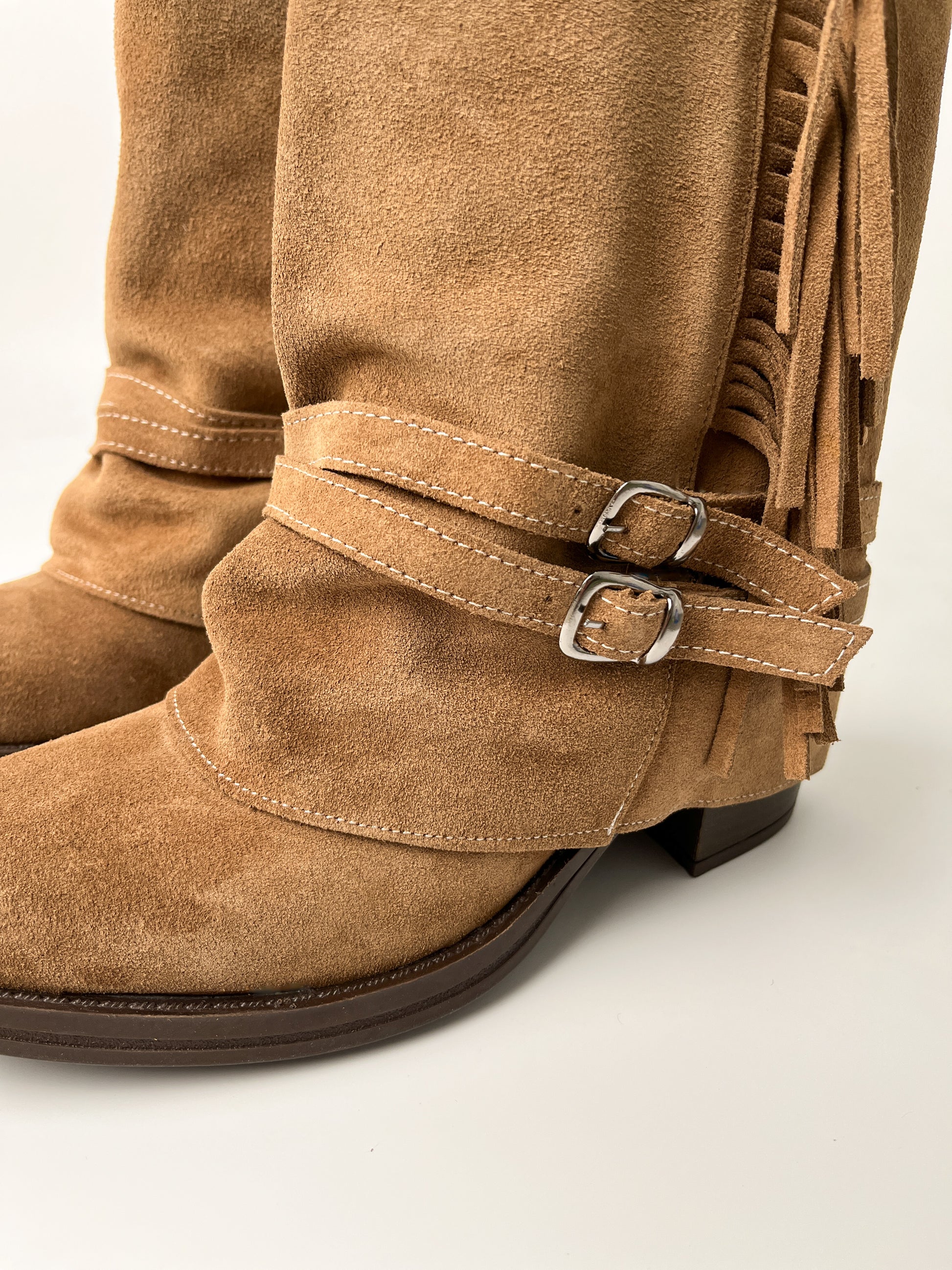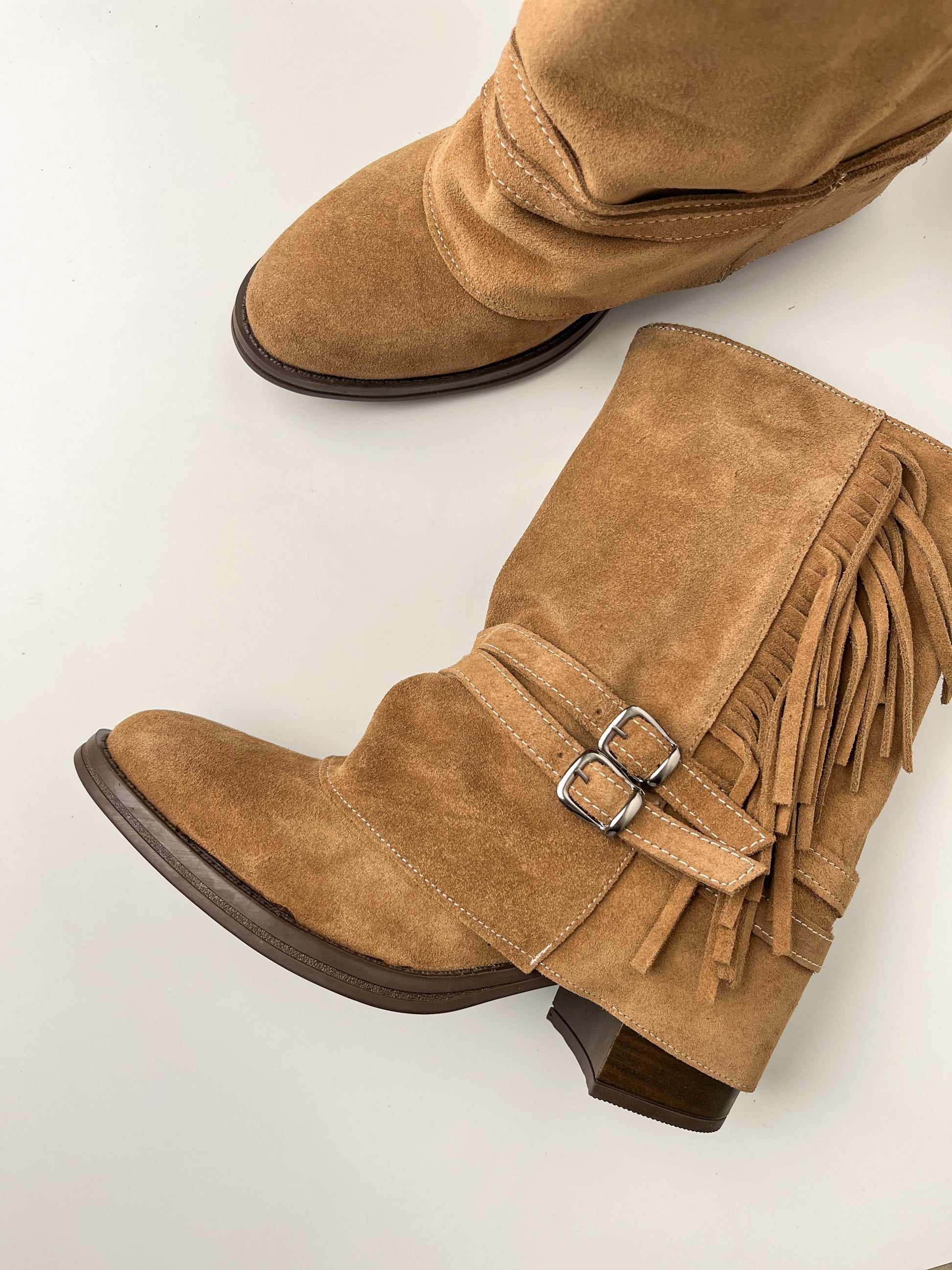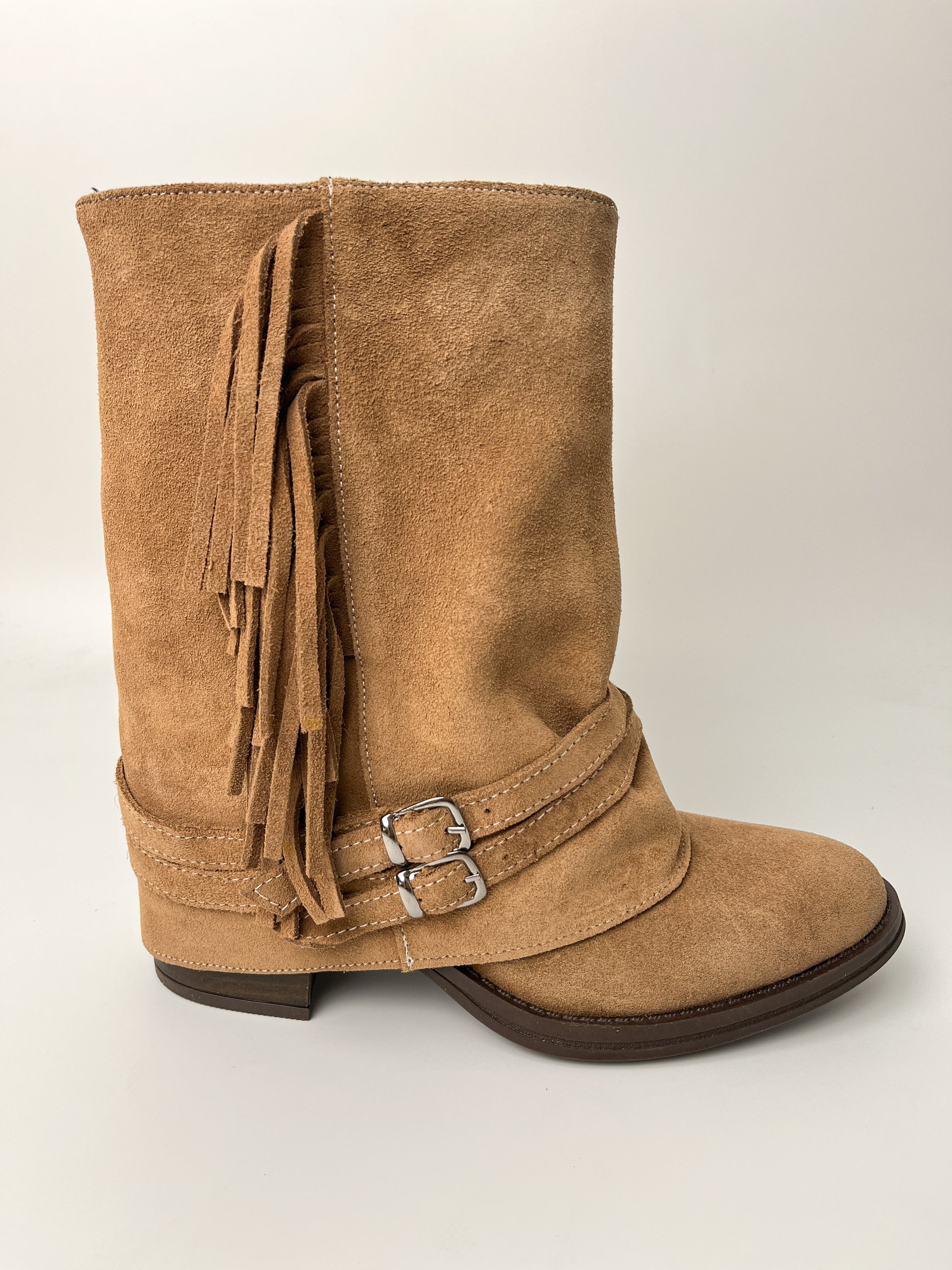 Yumuşak dokulu camel süet hakiki deriden üretilen bu mini bot, hem zarif hem rahat bir stile sahip.Yan kısmındaki püskül ve çift toka detaylarıyla modern bohem bir duruş sunar.Günlük kombinlerden özel davetlere kadar her ortamda şıklığı ve konforu bir arada yaşatır.İçi yumuşak astarlıdır ve uzun süreli kullanımda ayağı yormaz.