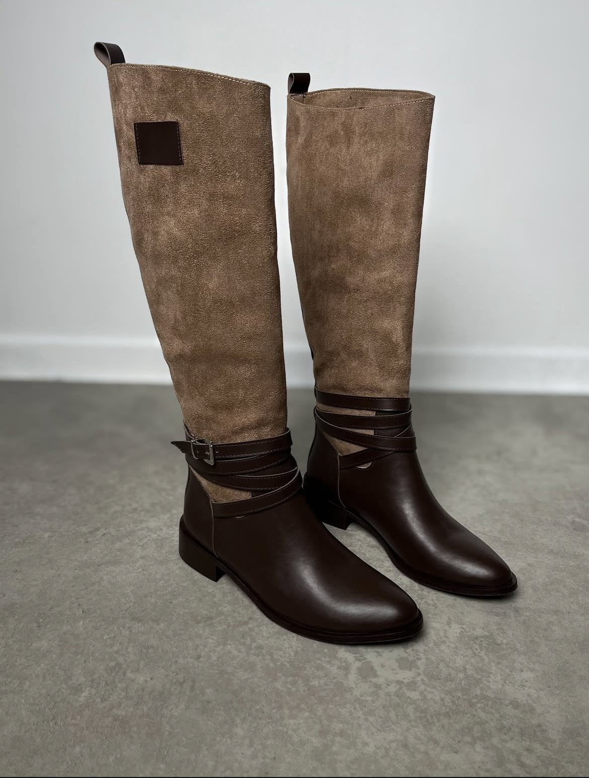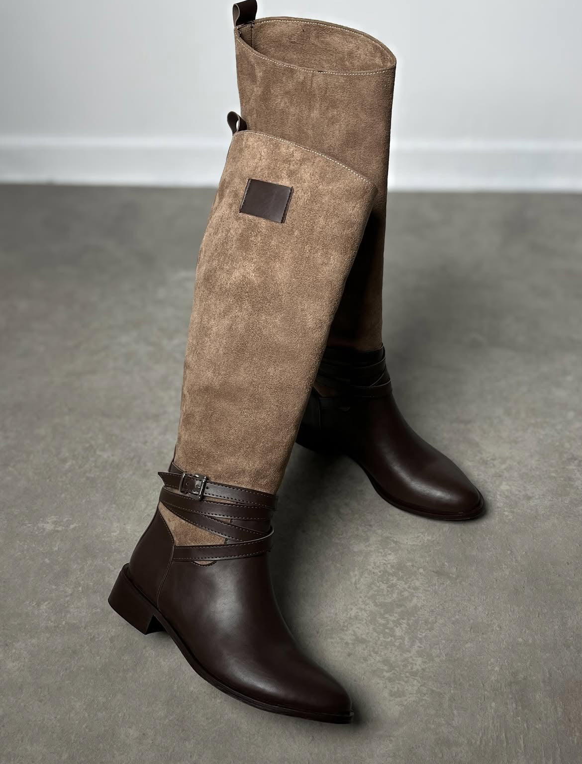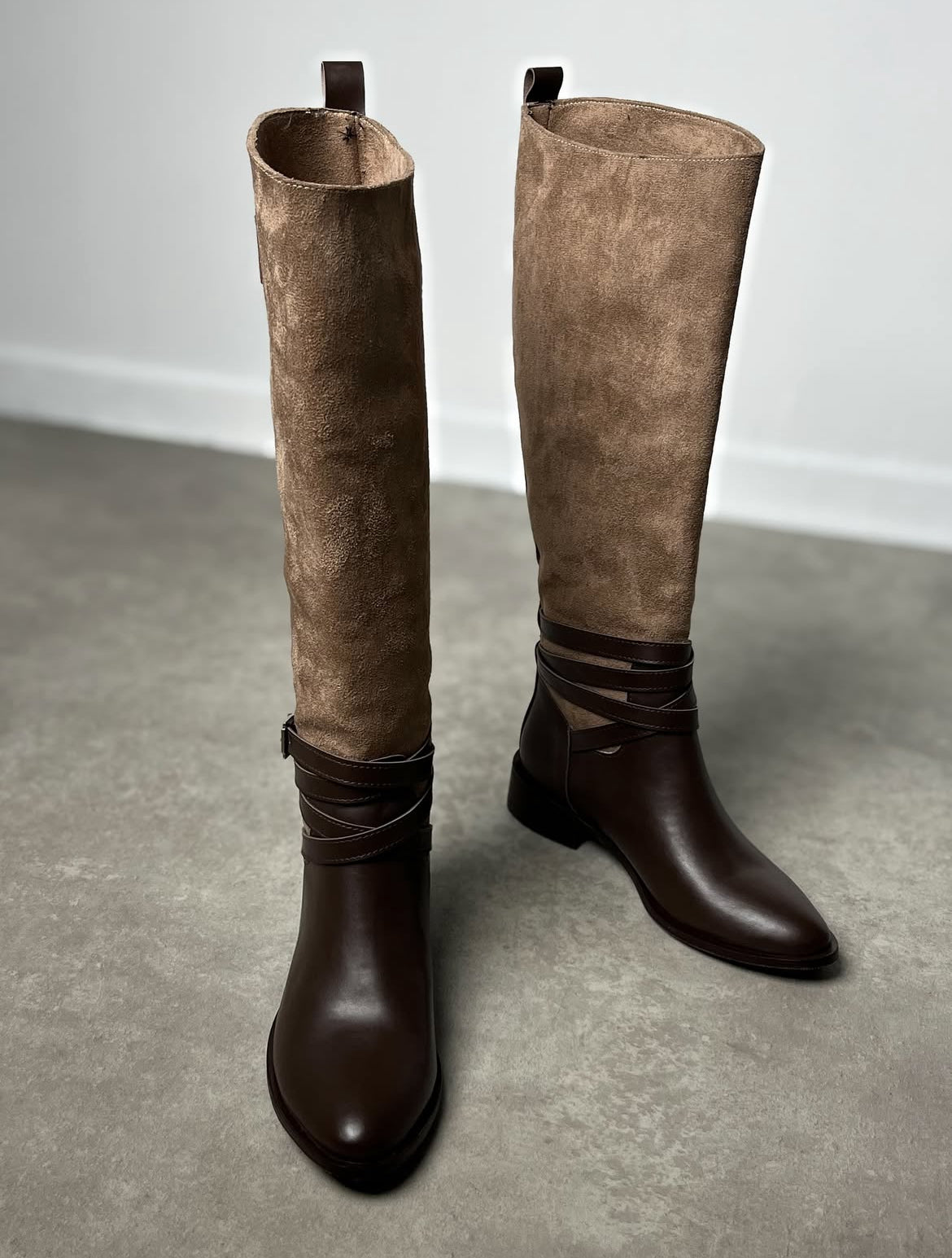 Binici stilinin zamansız şıklığını modern çizgilerle buluşturan bu uzun çizme modeli; bilek kısmındaki parlak kahverengi deri dokusu ve üst bölümdeki yumuşak süet yüzeyiyle premium bir görünüm sunar.