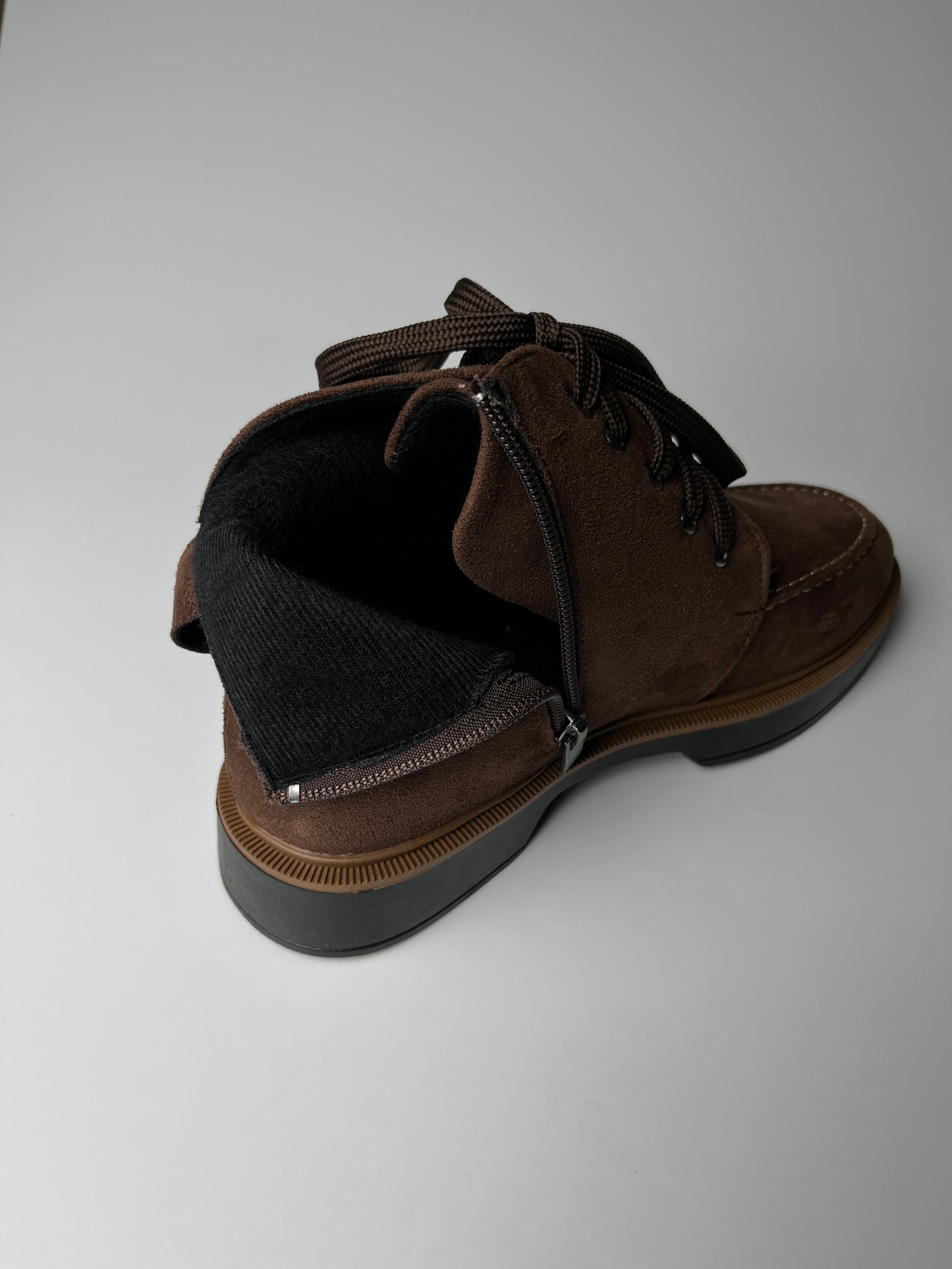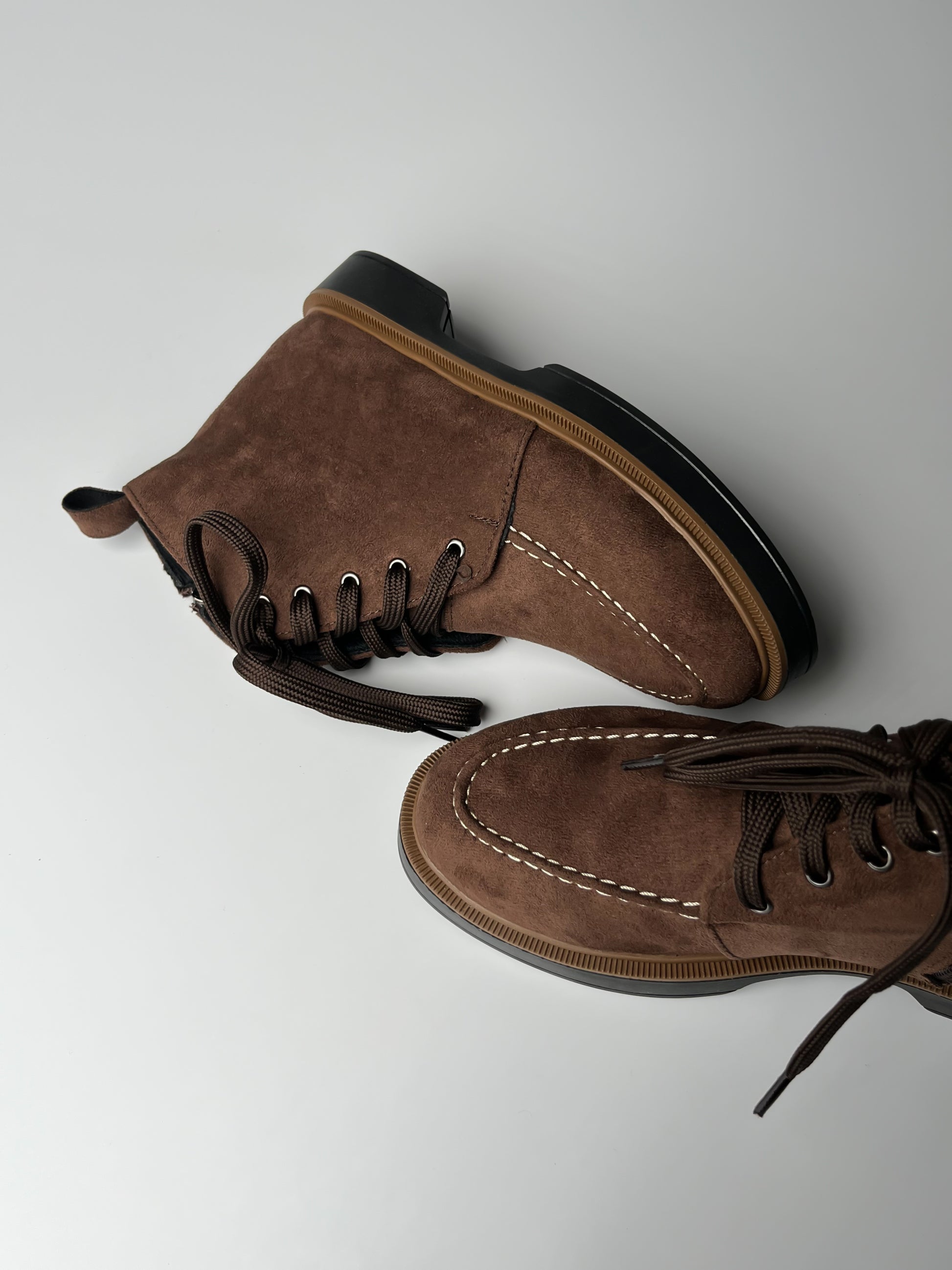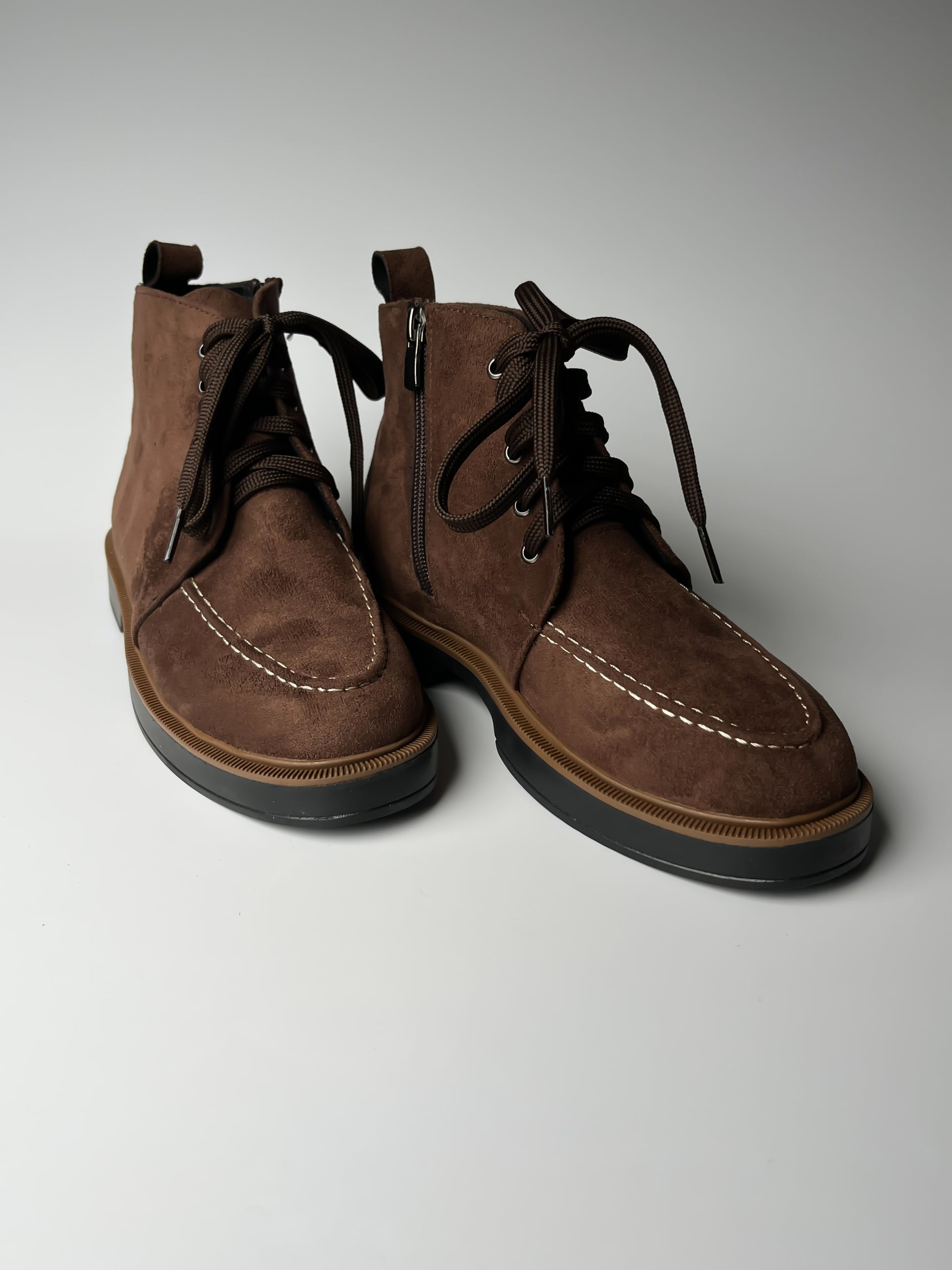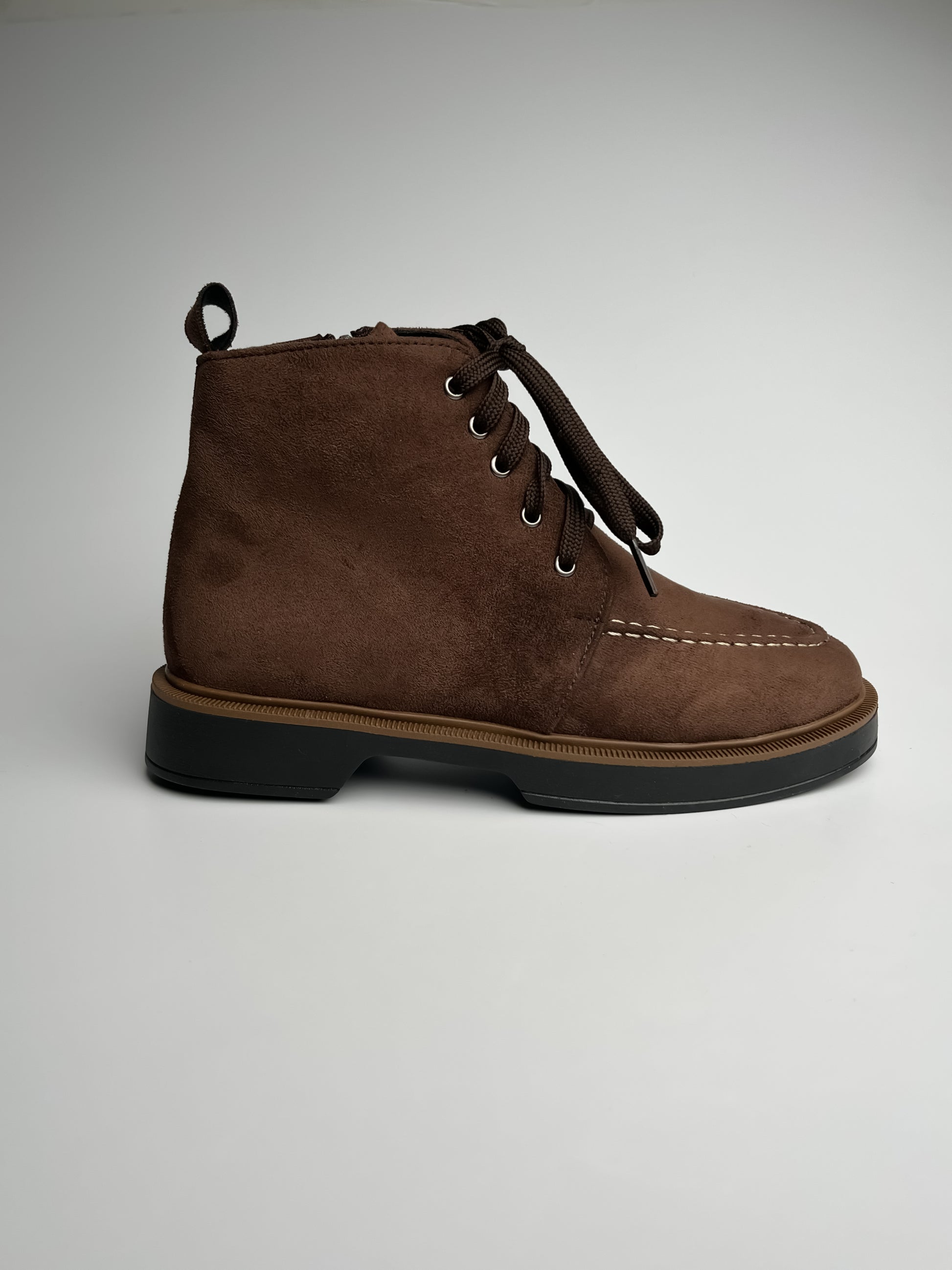 Kahverengi süet bağcıklı kadın bot – 36-40 numara aralığında, tam kalıp, 3 cm topuk boyu, kaymaz taban ve fermuar detaylı kışlık bot modeli. Günlük kullanımda şıklık ve rahatlığı bir arada sunar.