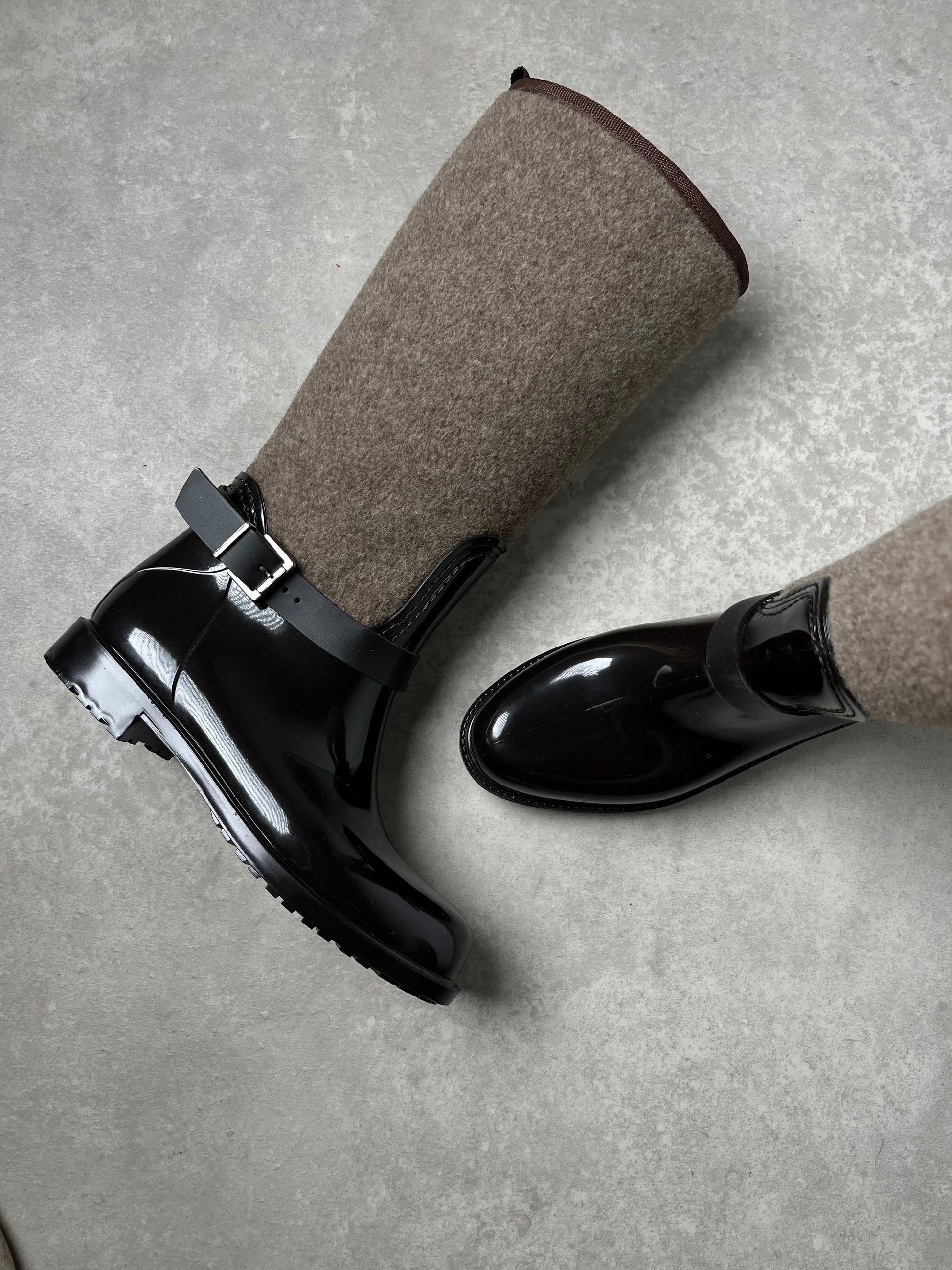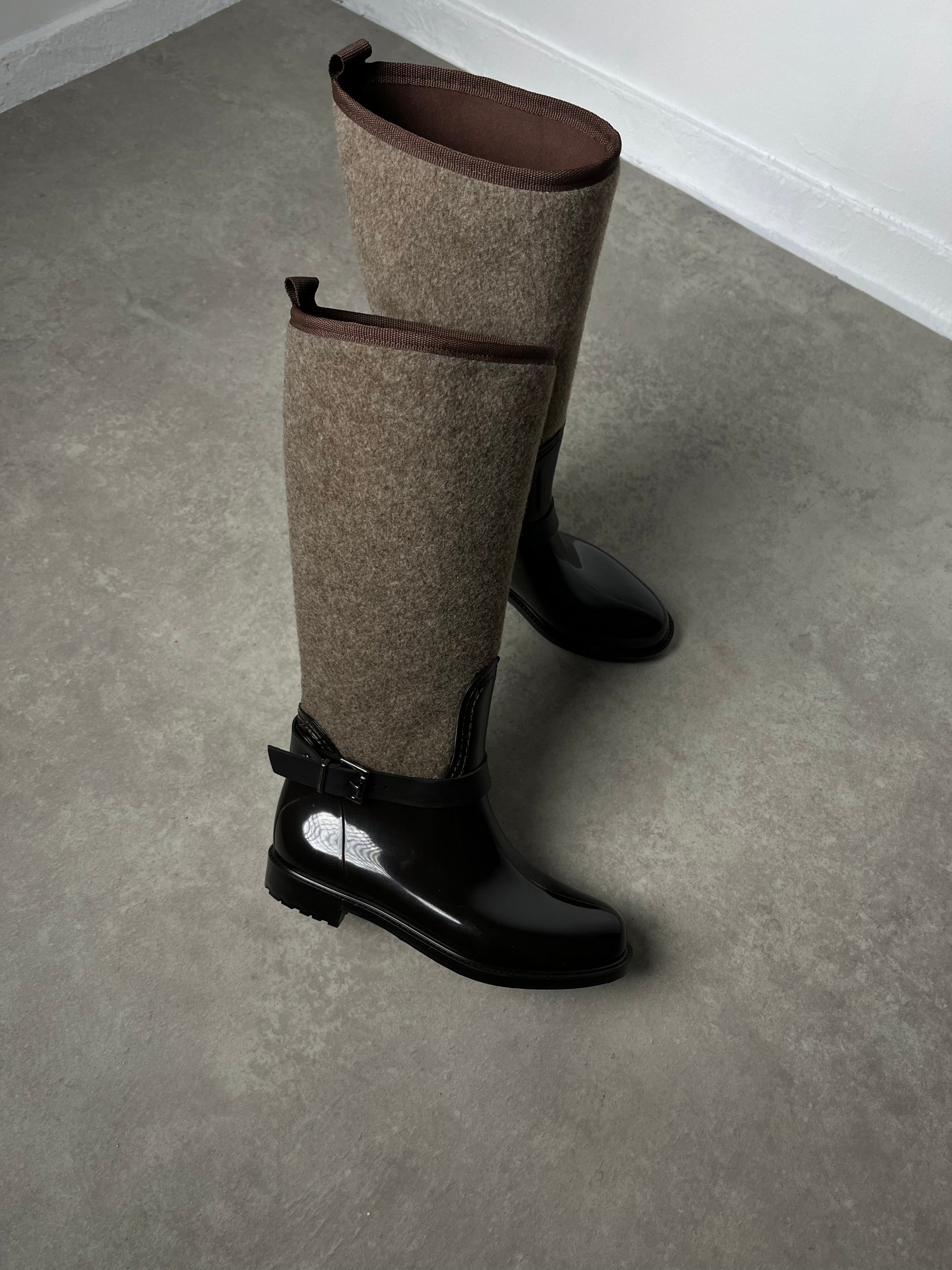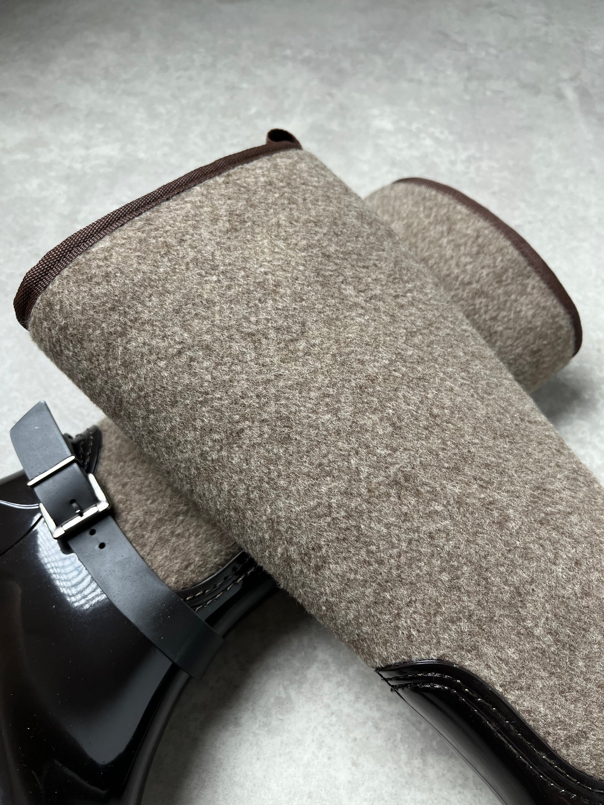 Kahverengi tokalı uzun yağmur çizmesi – keçe detaylı, su geçirmez dış yüzeyli, sıcak astarlı ve kaymaz tabanlı tasarımıyla şıklığı ve rahatlığı bir araya getirir.
