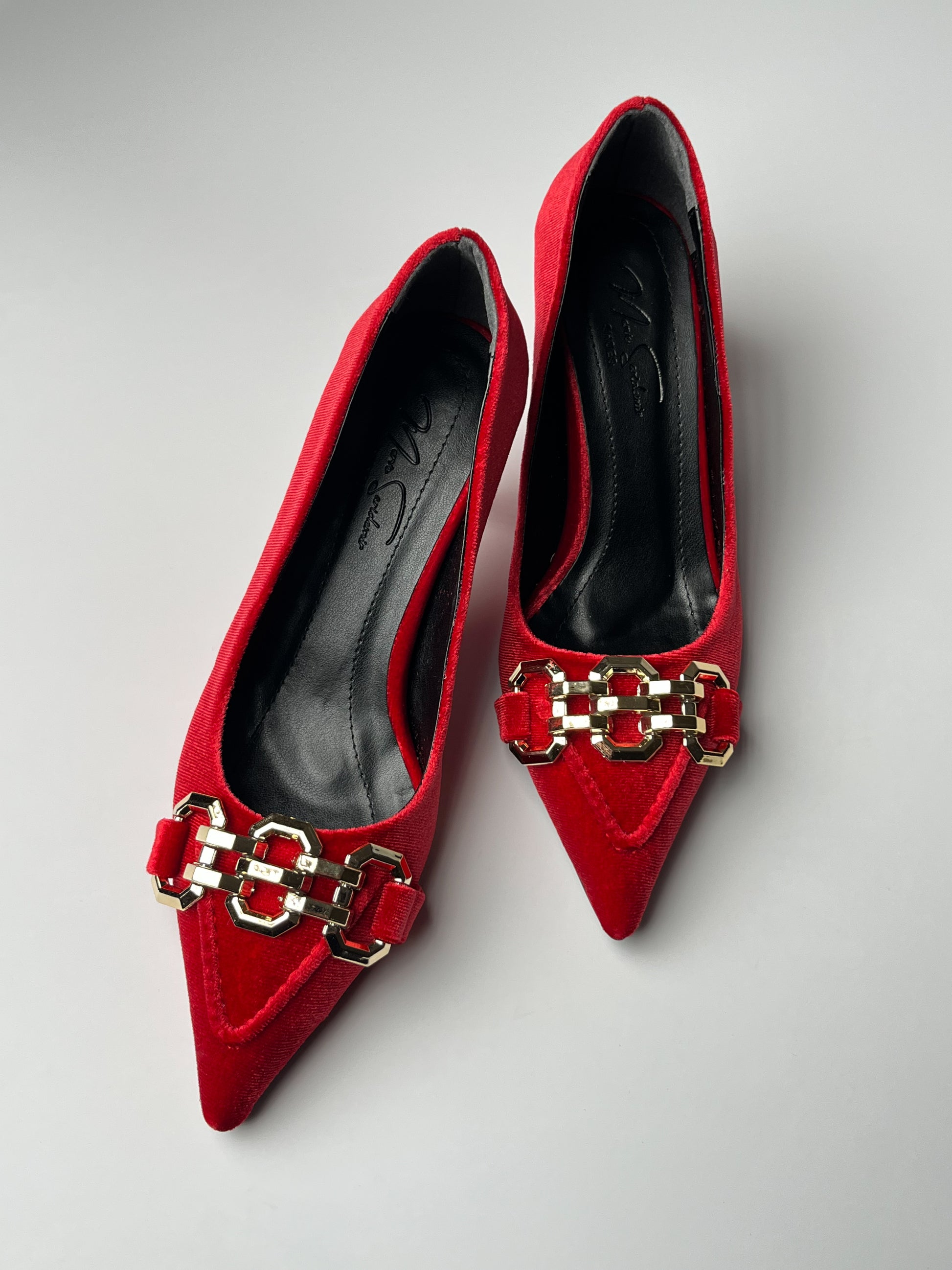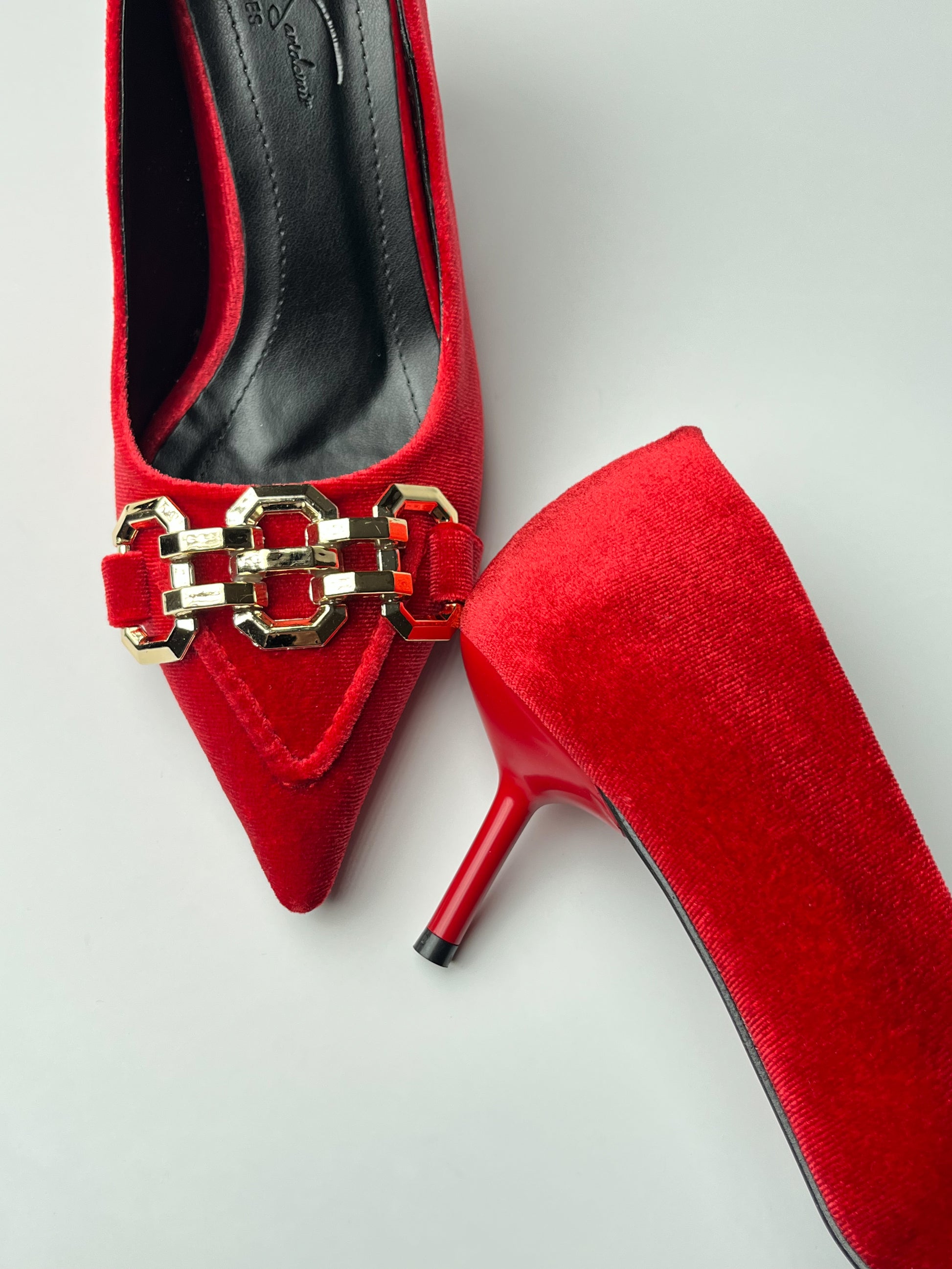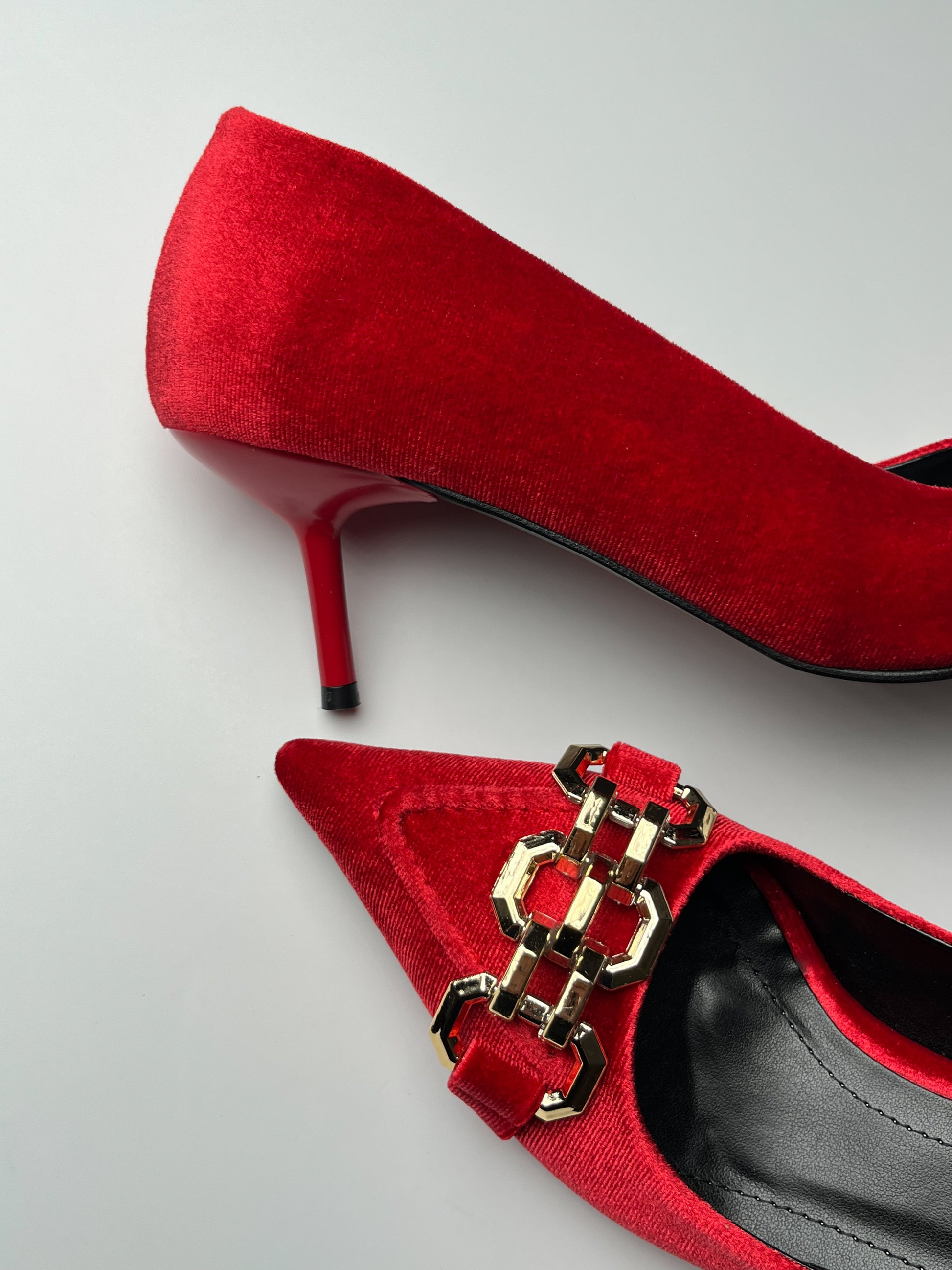 Kırmızı Süet Zincir Detaylı İnce Topuklu Ayakkabı