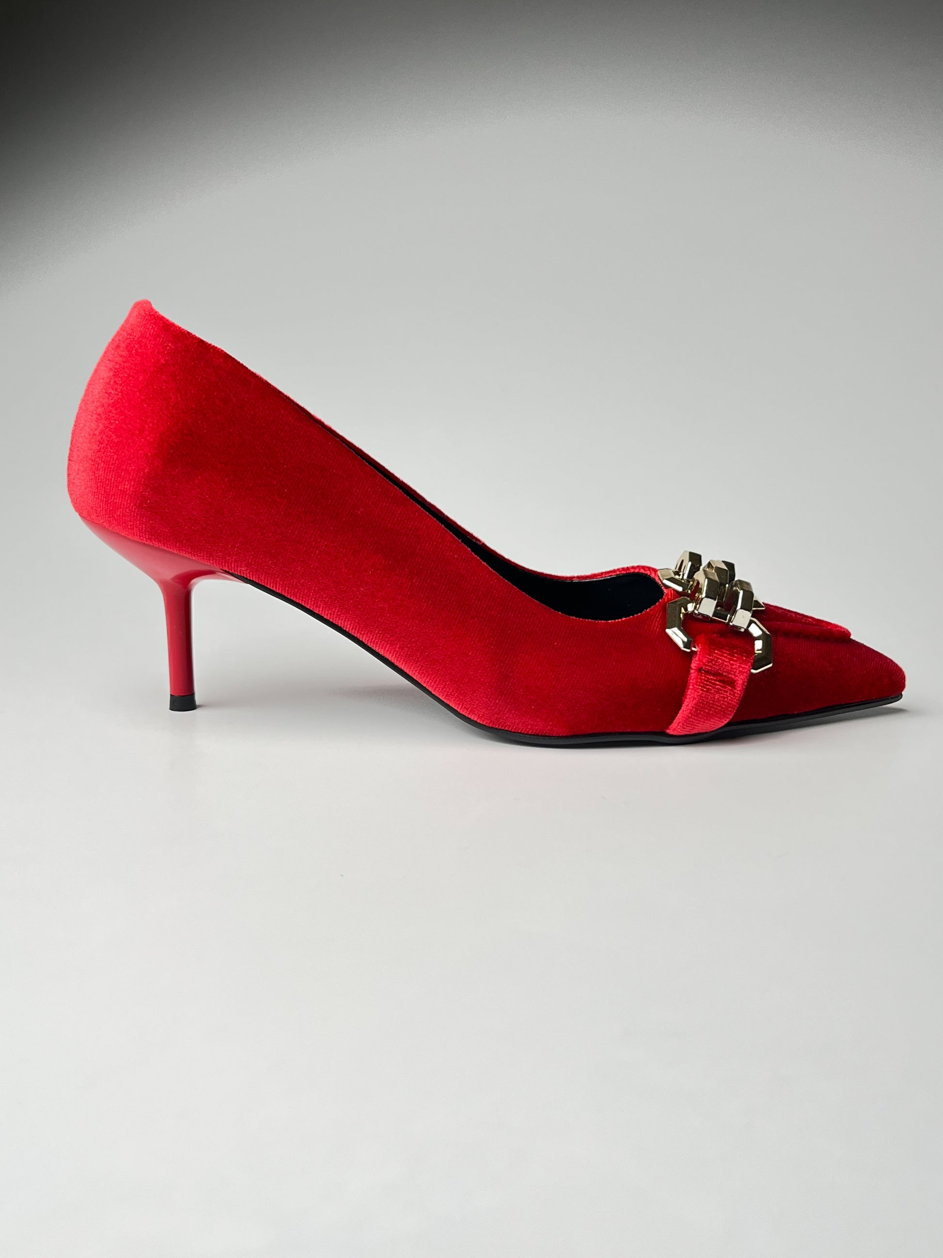 Zarif ve dikkat çekici tasarımıyla kırmızı süet zincir detaylı topuklu ayakkabı, stilinize lüks bir dokunuş katıyor. Sivri burun formu ve altın zincir aksesuarı ile özel günlerde, davetlerde veya şık kombinlerinizde fark yaratır. 6 cm ince topuğu hem feminen hem de rahat bir kullanım sunar.