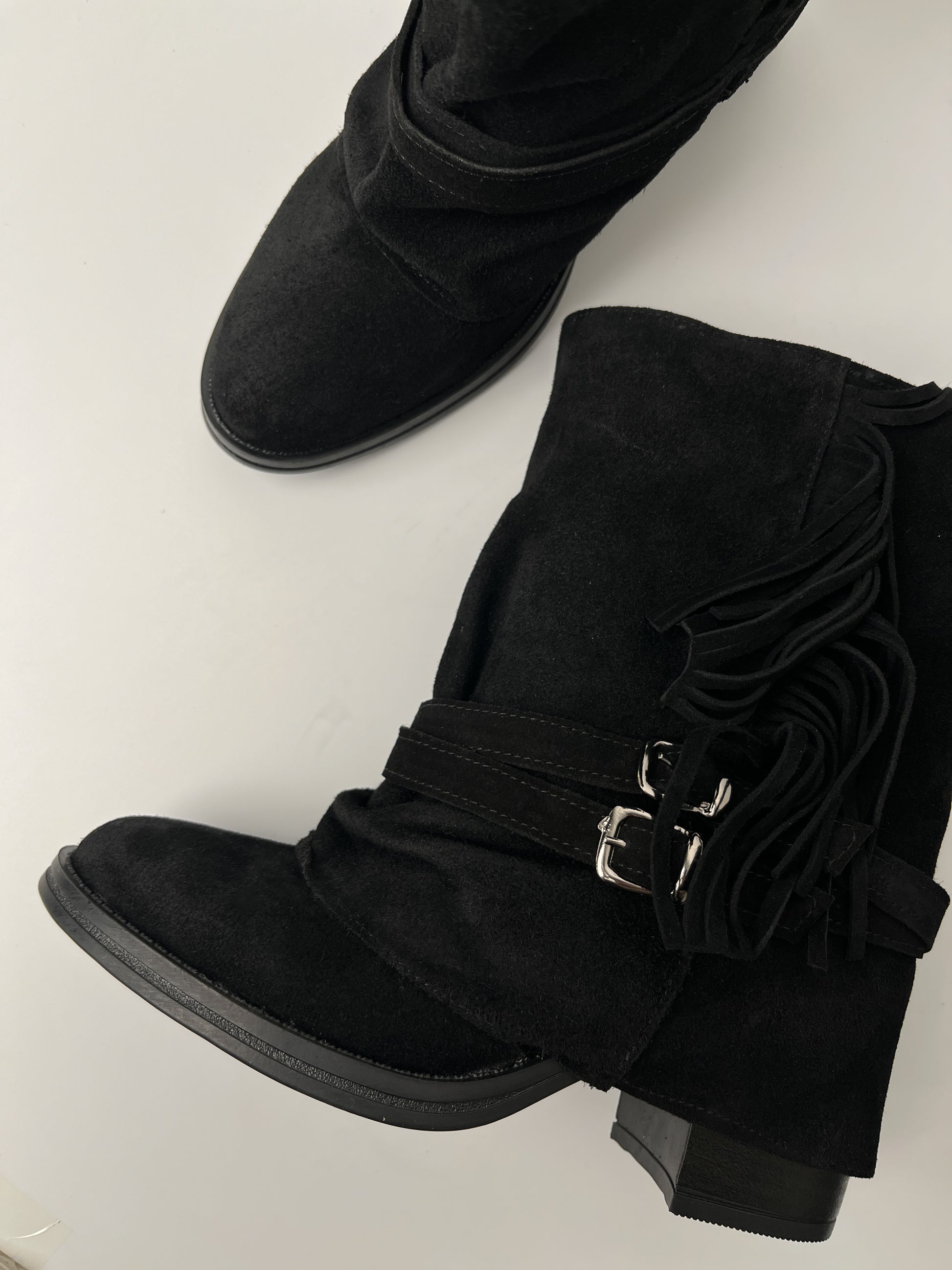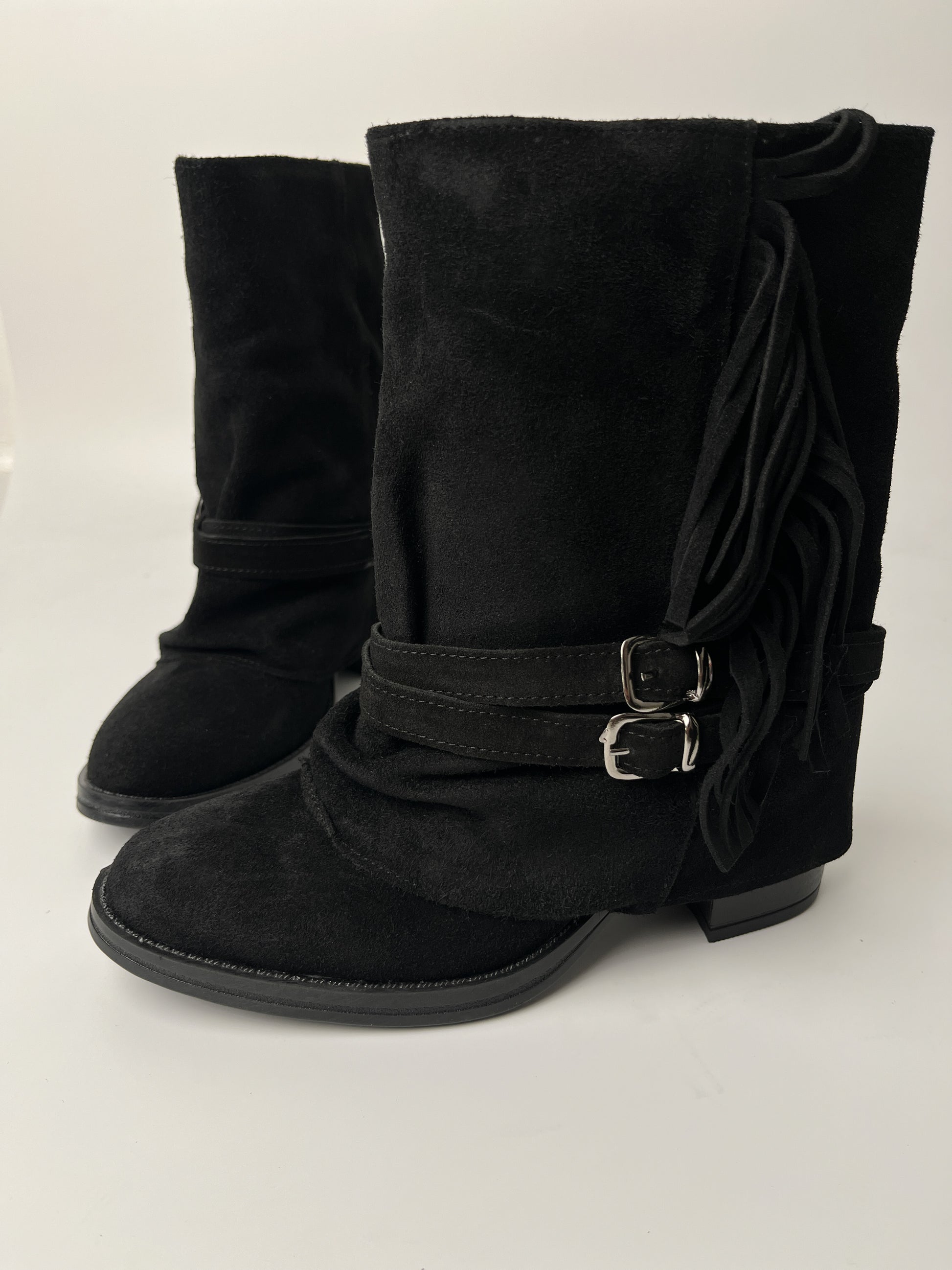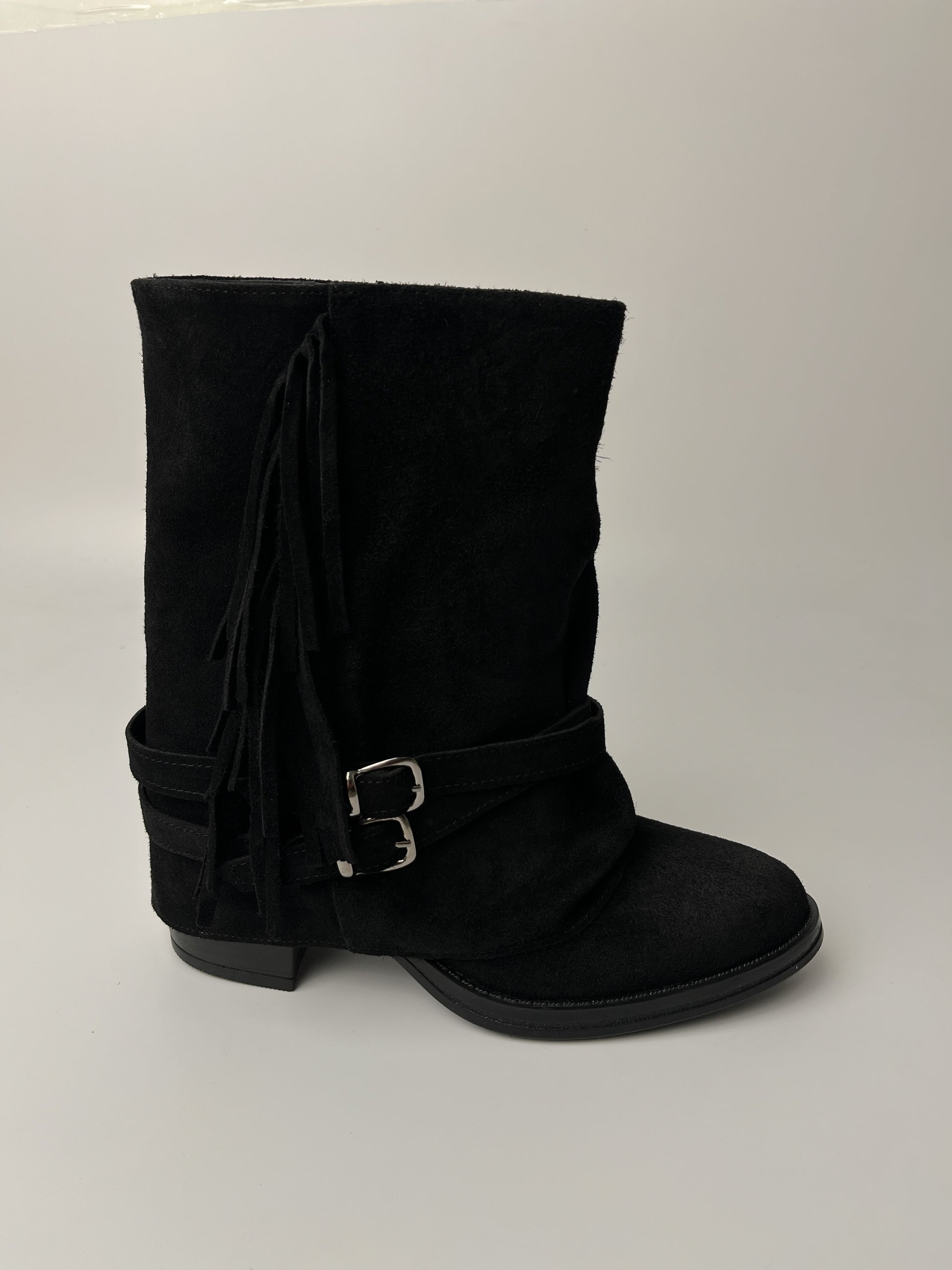 Siyahın güçlü duruşunu western tarzıyla buluşturan bu hakiki deri bot, hem modern hem de karakterli bir stil arayanlar için özel olarak tasarlandı. Yumuşak dokulu deri yüzeyi, yan kısmındaki püsküller ve çift toka detayı ile dikkat çekici bir görünüm sunar.