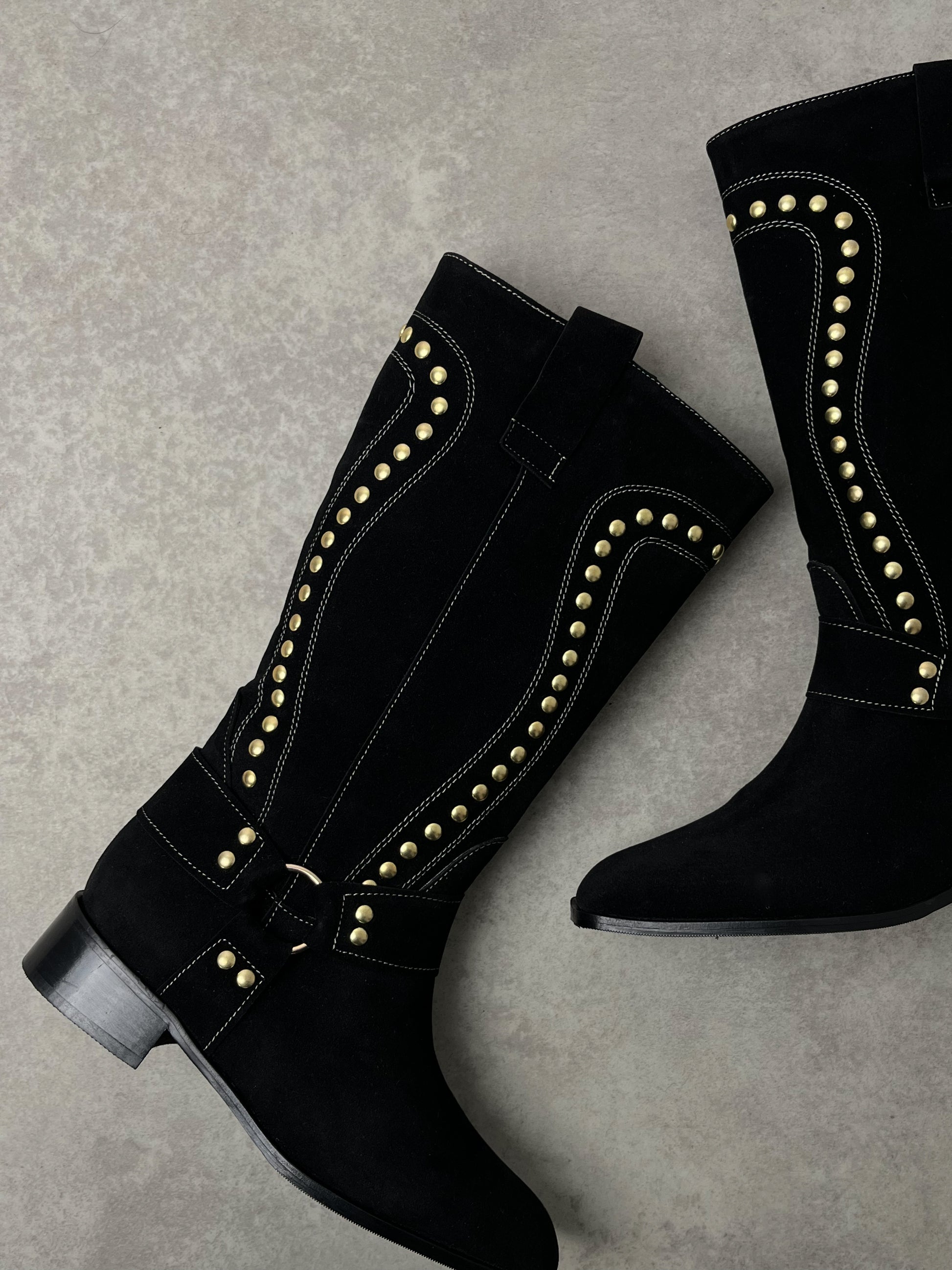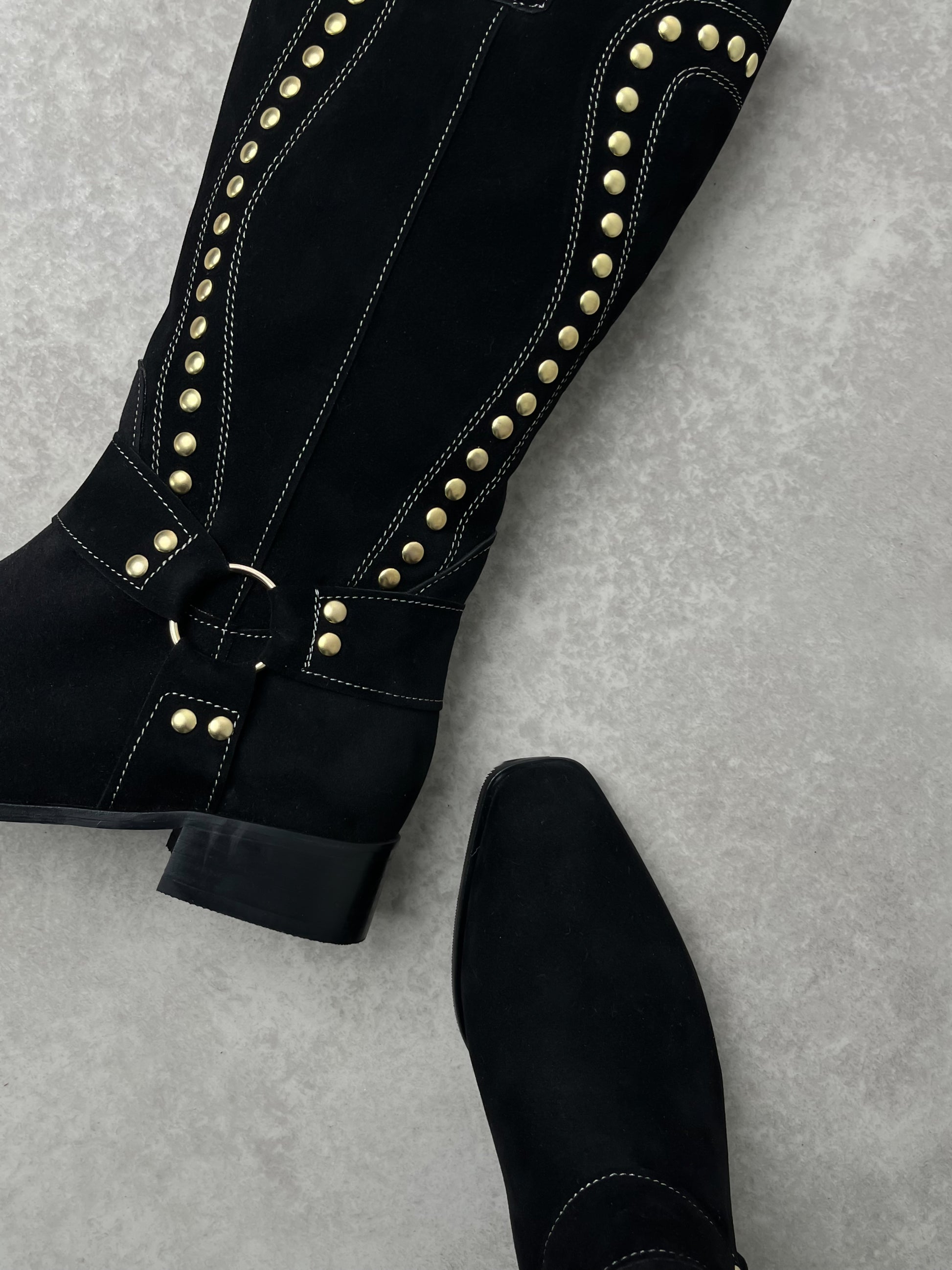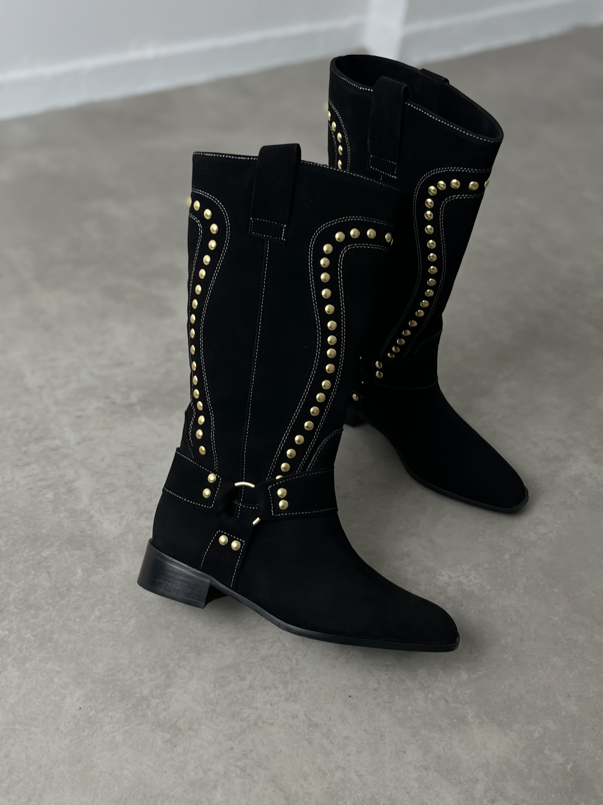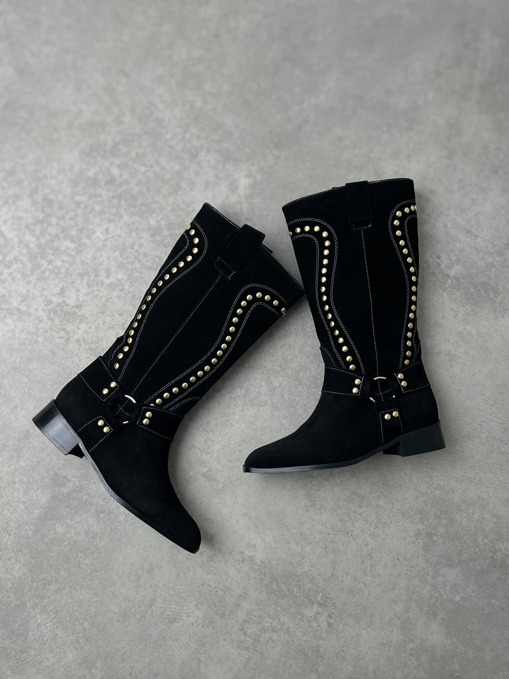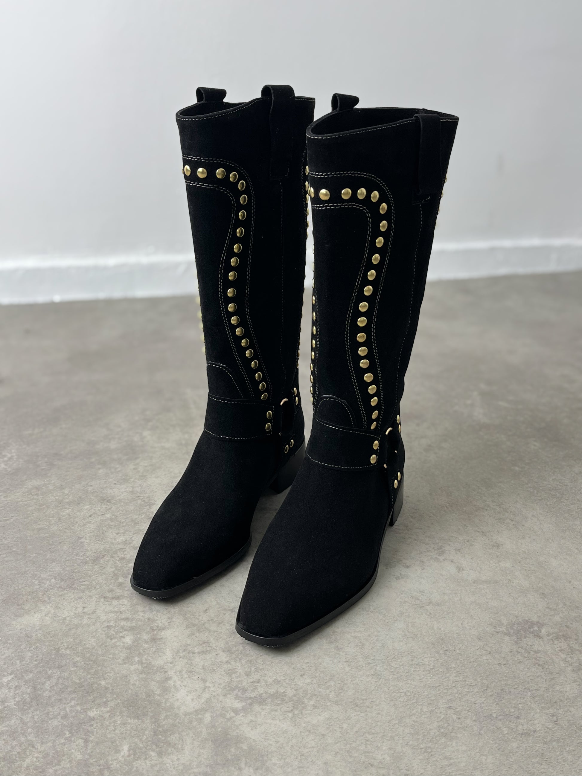 Klasik kovboy çizmesinin modern yorumuyla buluşan bu model, süet dokusu ve altın renkli trok detaylarıyla iddialı bir şıklık sunar. Günlük kombinlerden özel davetlere kadar birçok stile uyum sağlar. Yumuşak iç astarı ve alçak topuğu sayesinde gün boyu konfor sunarken, sağlam tabanı uzun süreli kullanım imkânı verir.