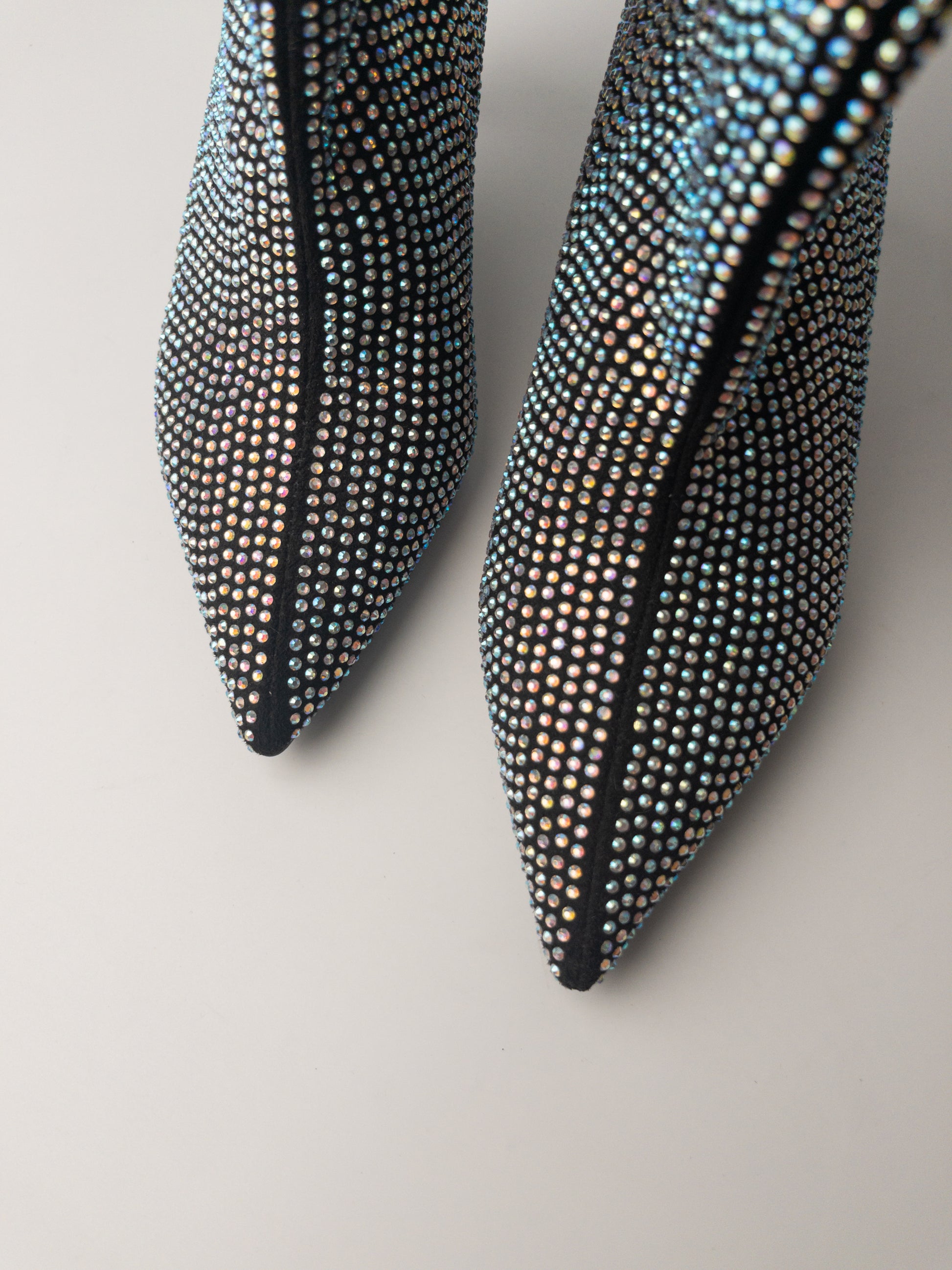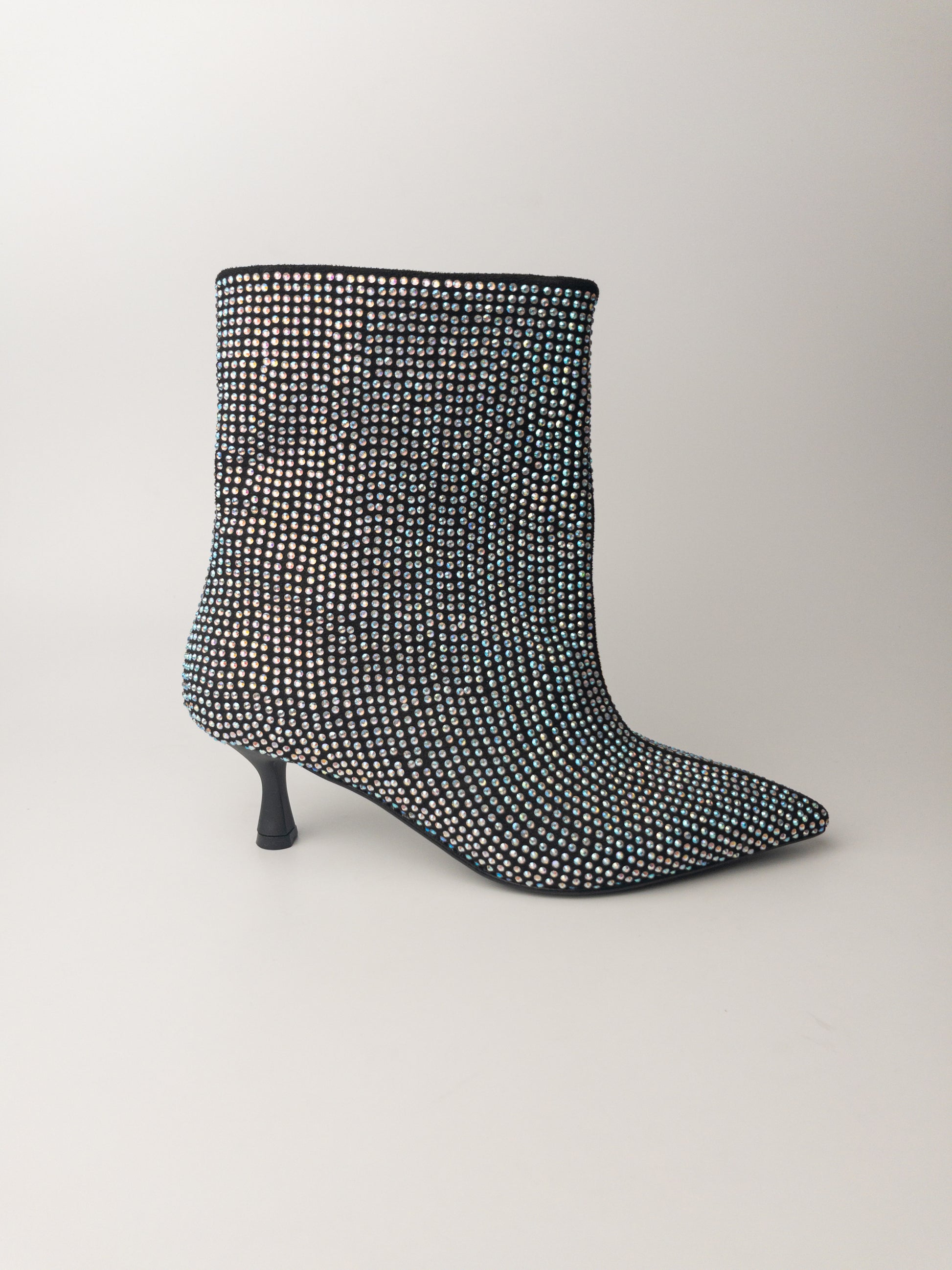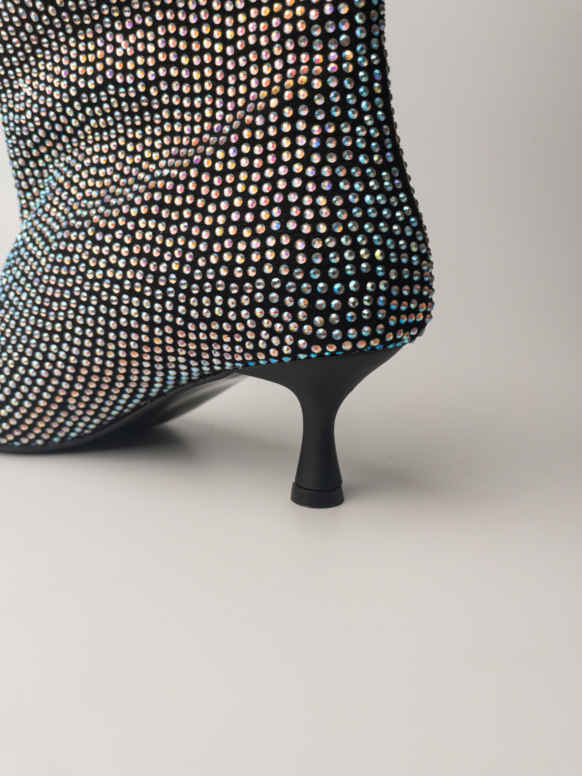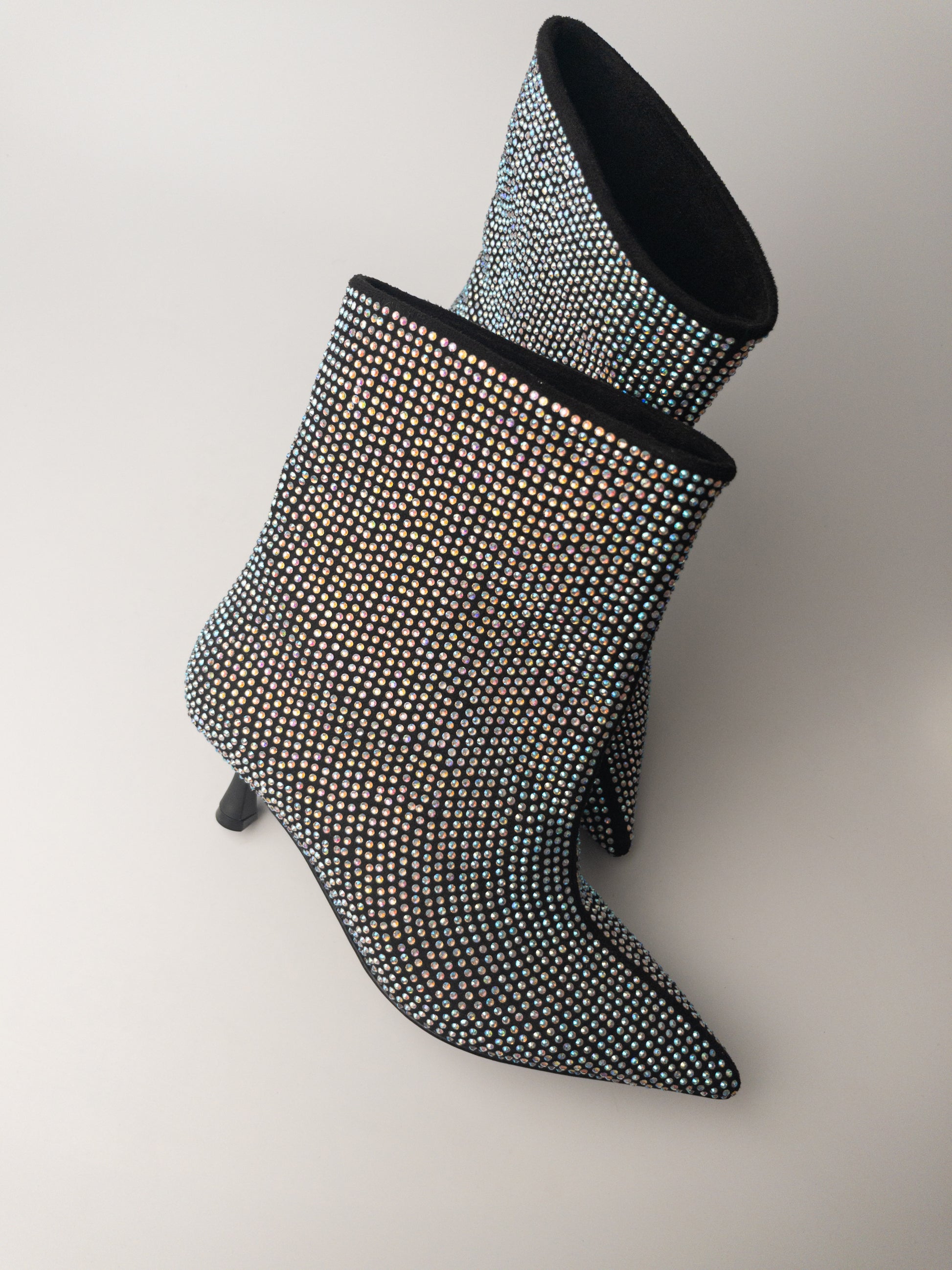 Işıltısıyla tüm dikkatleri üzerine çeken bu siyah taş detaylı bot, modern şıklığın en göz alıcı hâlidir. Üzerindeki mikro taş işlemeler ışığı kusursuzca yansıtarak hem gece hem gündüz kombinlerinde iddialı bir görünüm oluşturur.