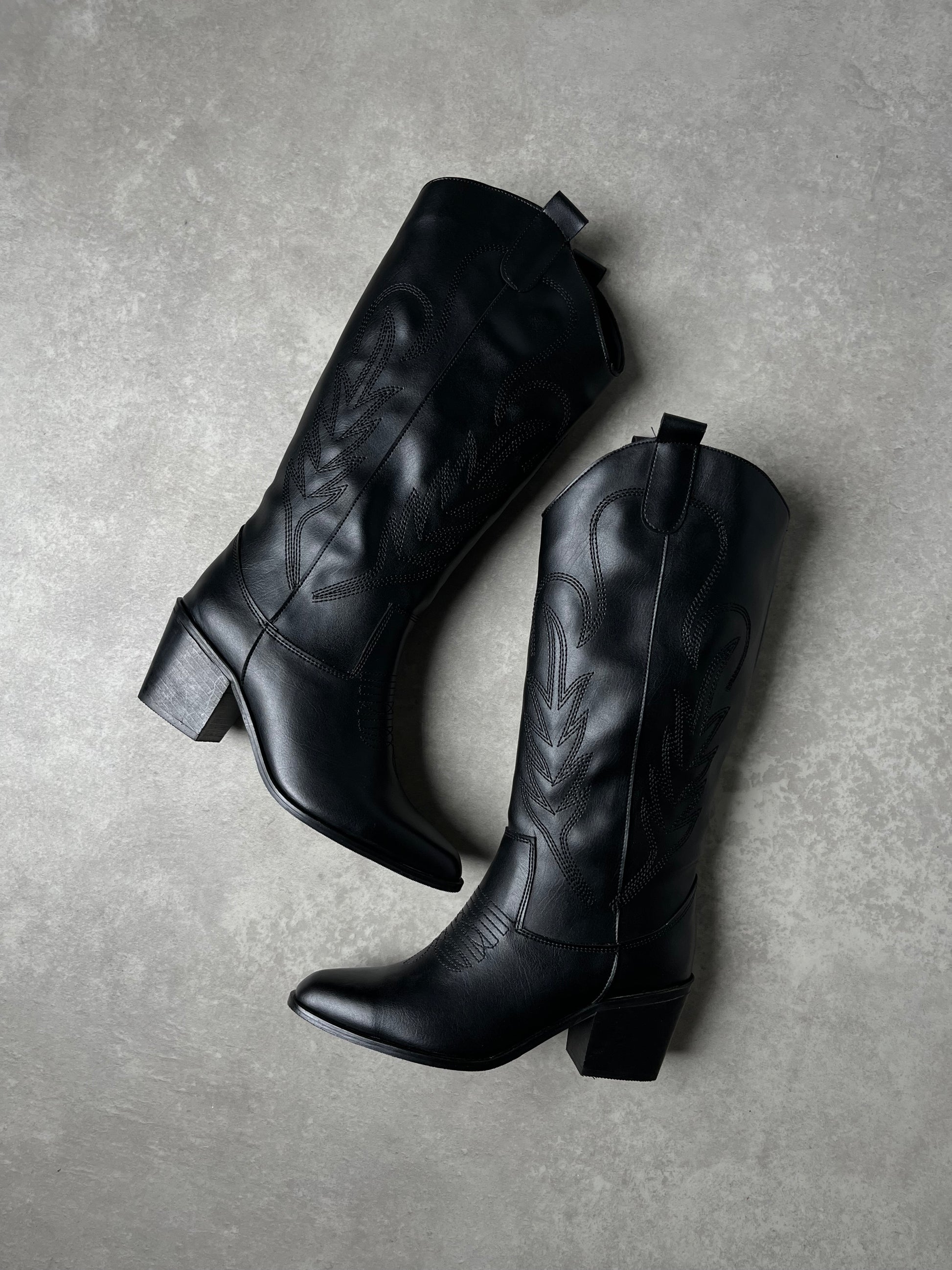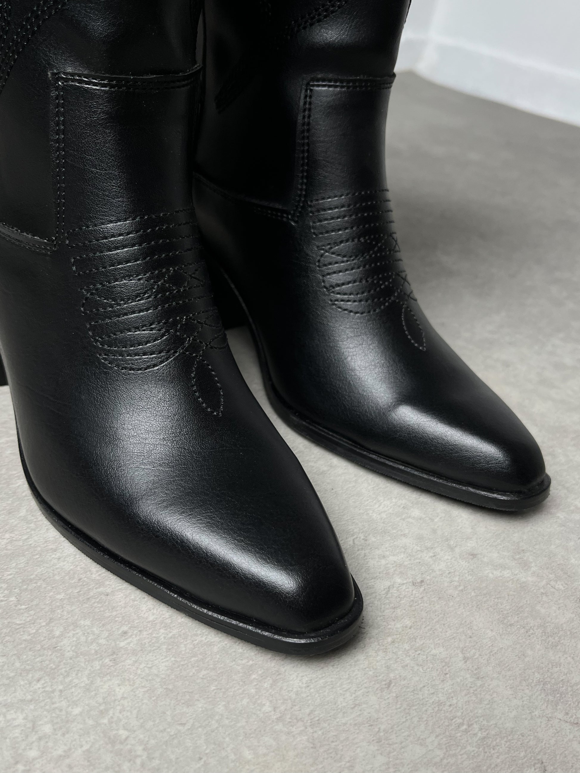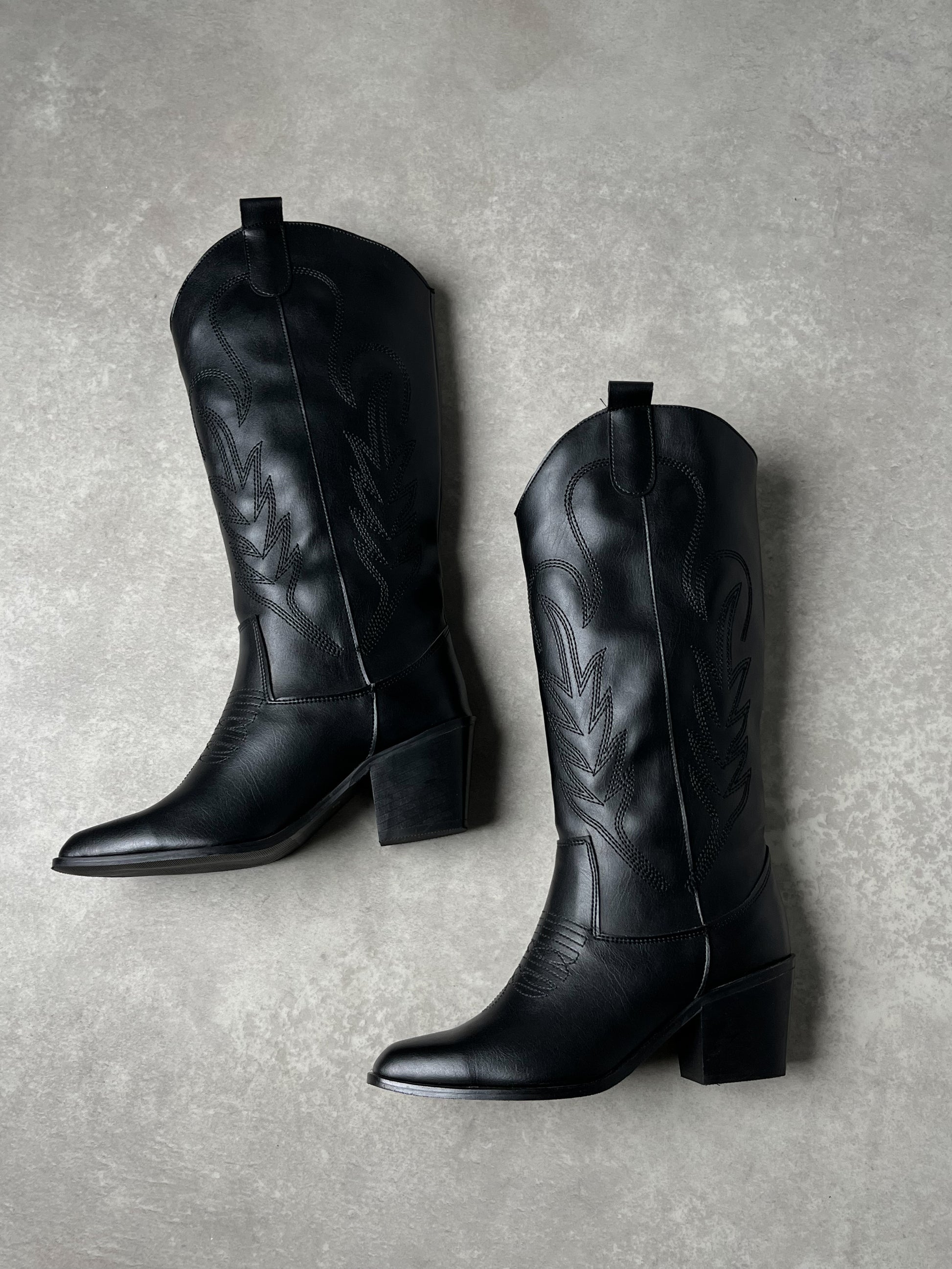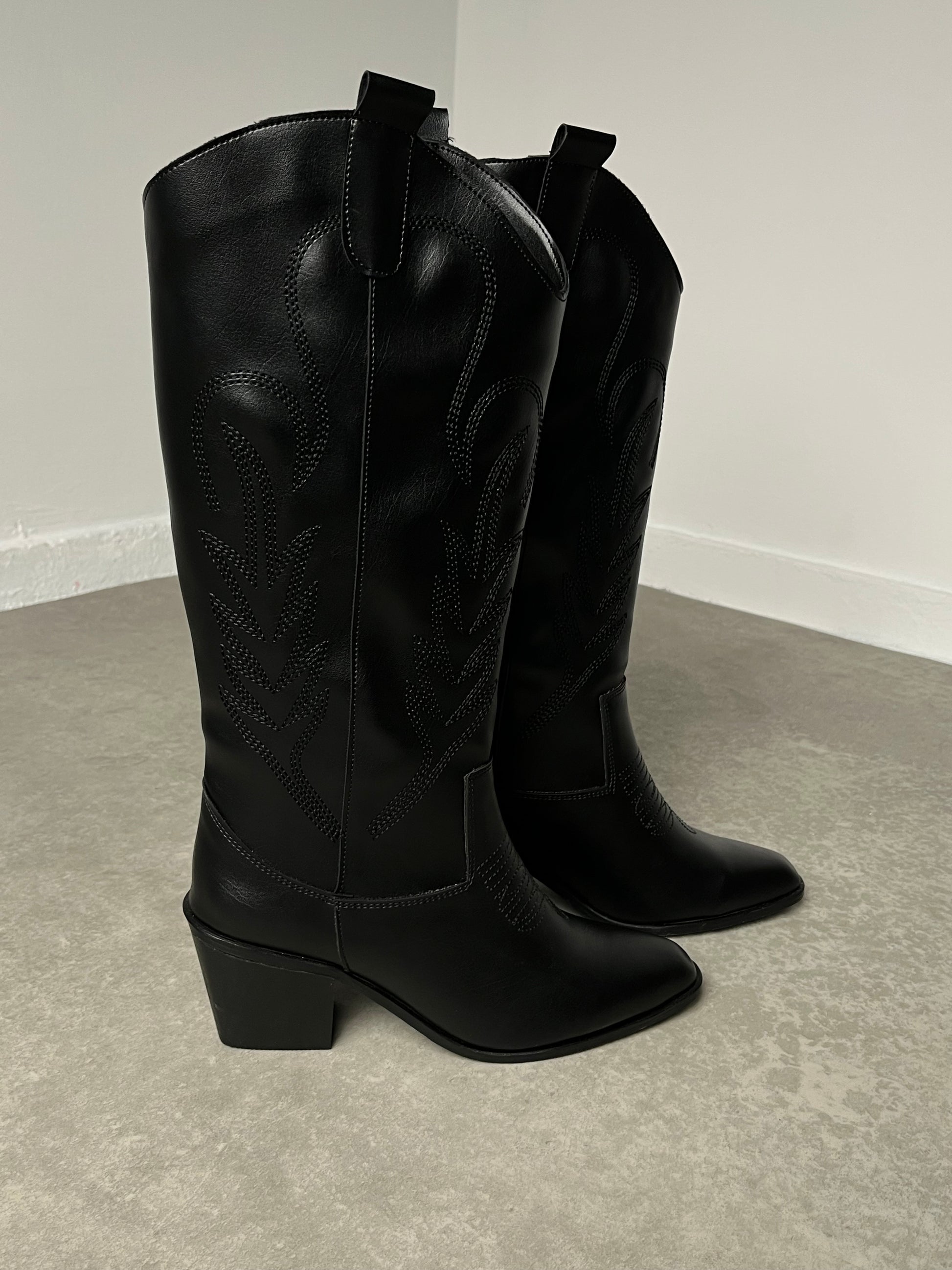Klasik western ruhunu modern şehir tarzıyla buluşturan bu çizme, iddialı duruşuyla sezonun favorisi olmaya aday. Parlak siyah hakiki deri yapısı, zarif dikiş detayları ve konik topuğu ile her adımda güçlü bir stil yaratır. Hem günlük hem özel kombinlerde göz alıcı bir tamamlayıcı.