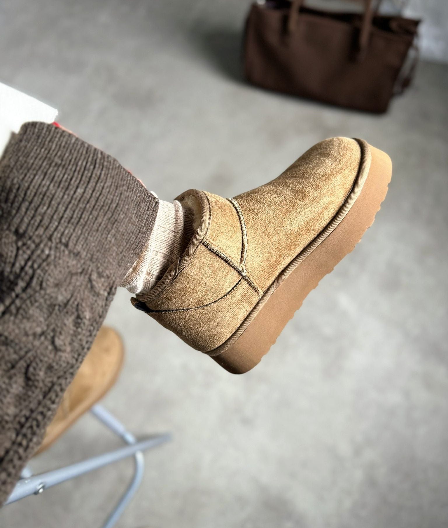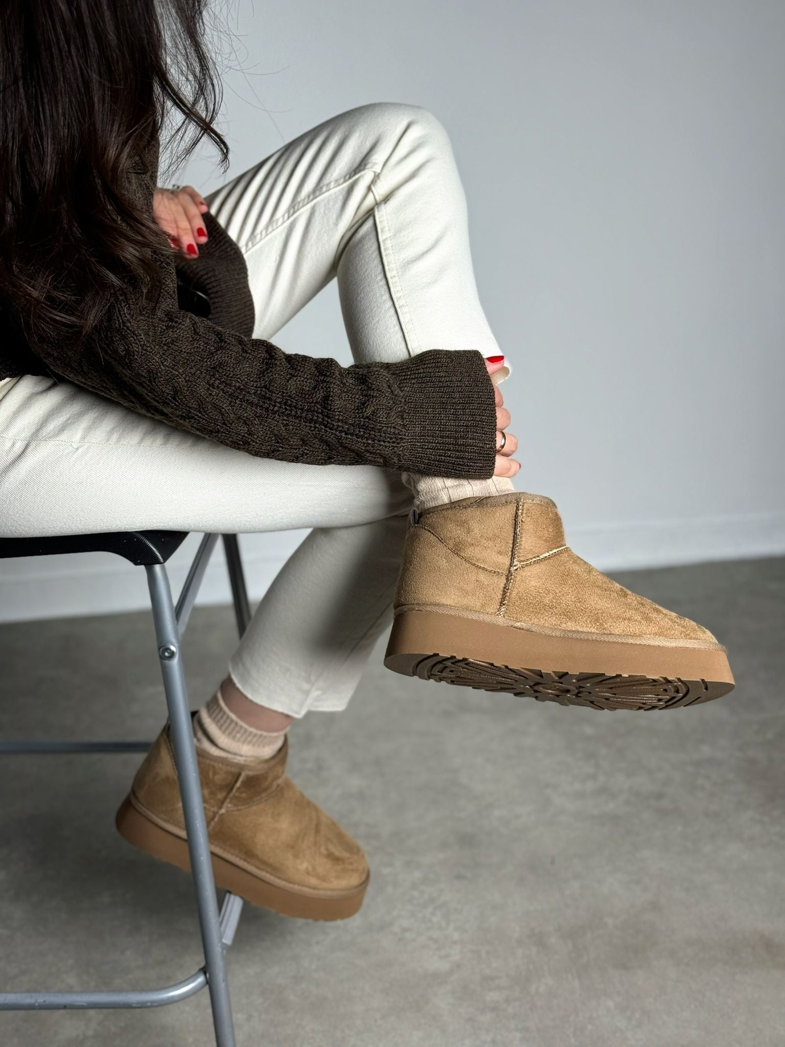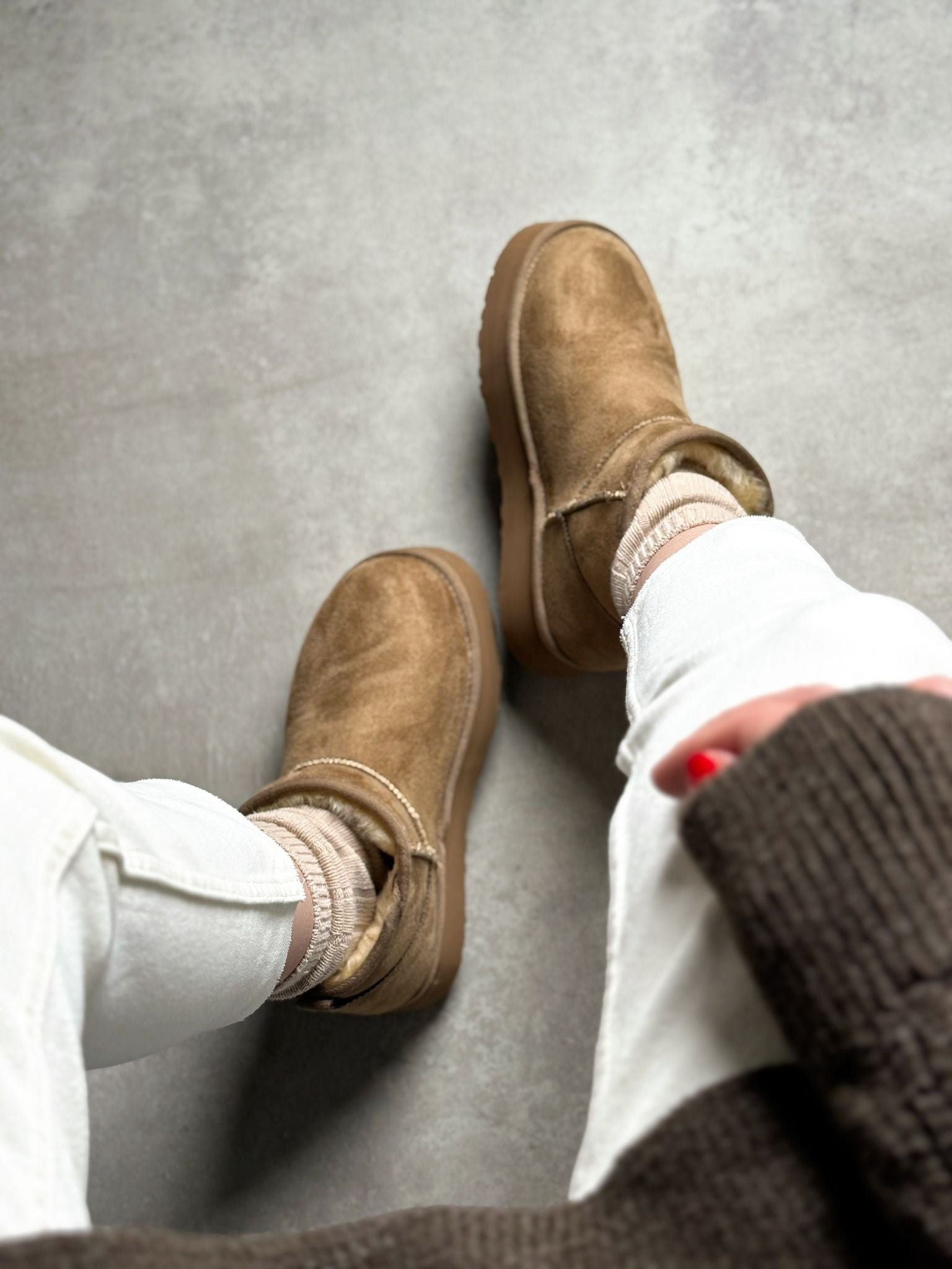 Yumuşacık kürklü iç astarıyla sıcacık tutarken, doğal süet dokusuyla şıklığı tamamlar. Hafif tabanı ve rahat kalıbı sayesinde gün boyu konfor sunar. Şehirde ya da hafta sonu kombinlerinde zahmetsiz bir zarafet sağlar.