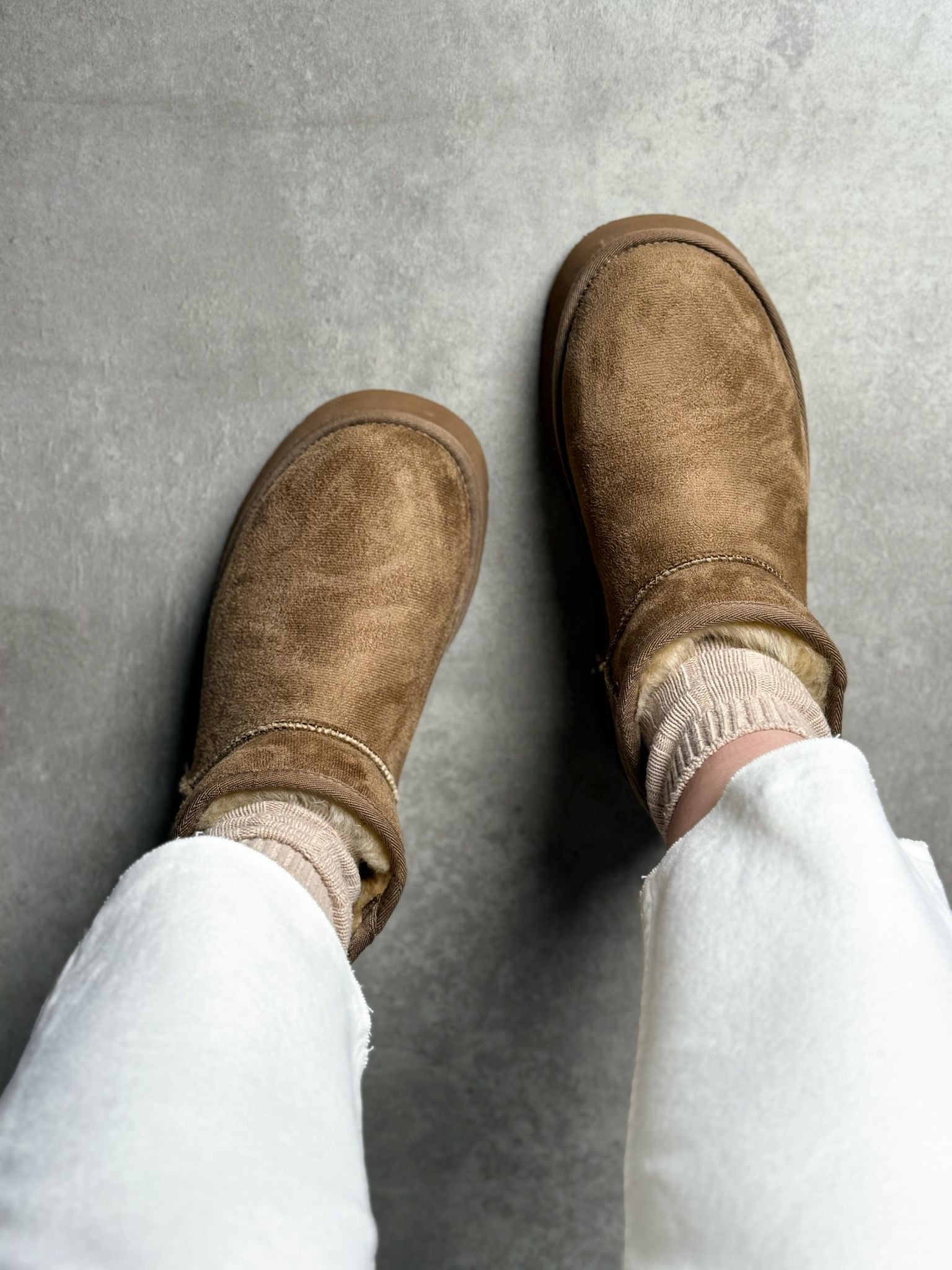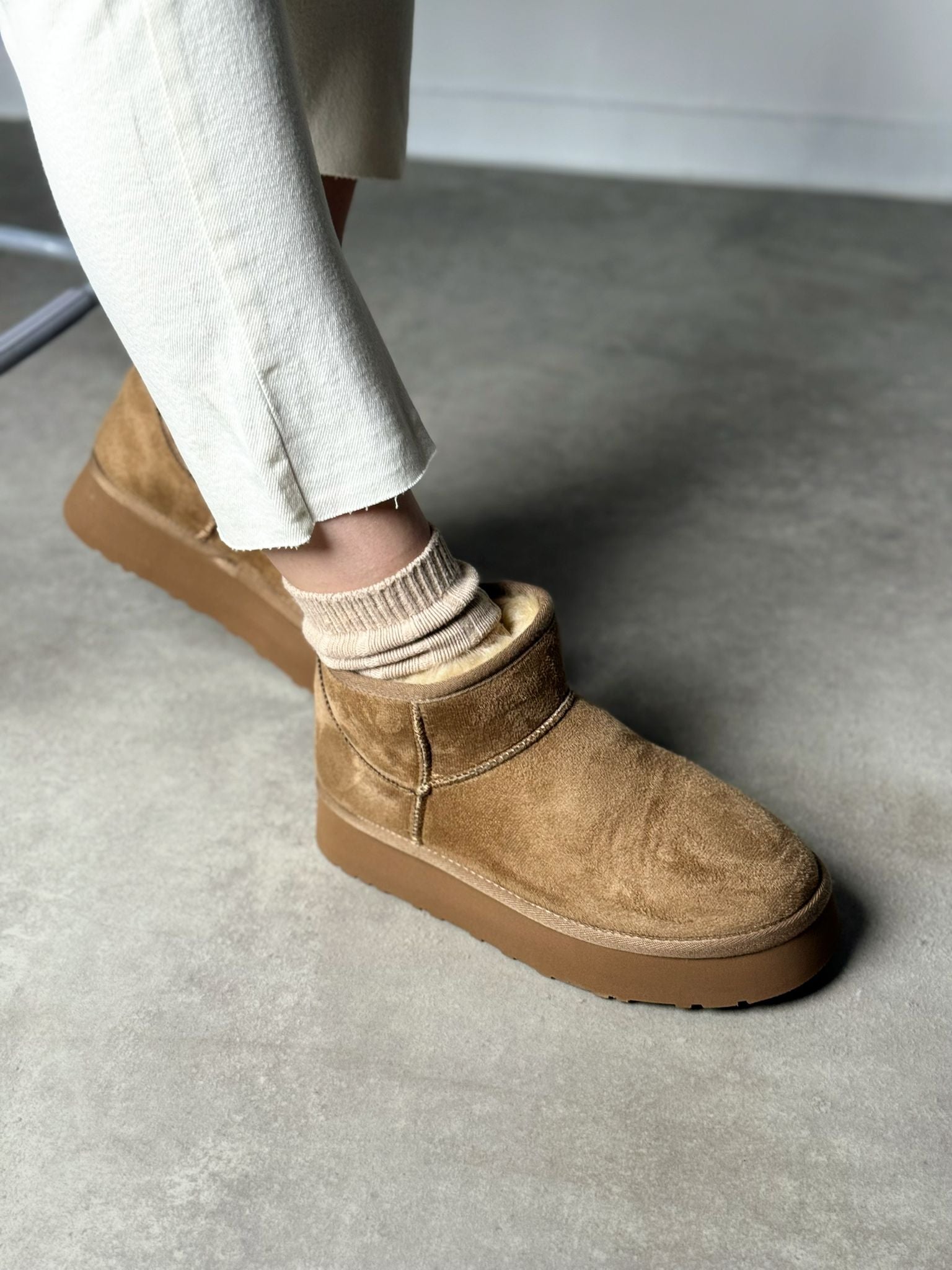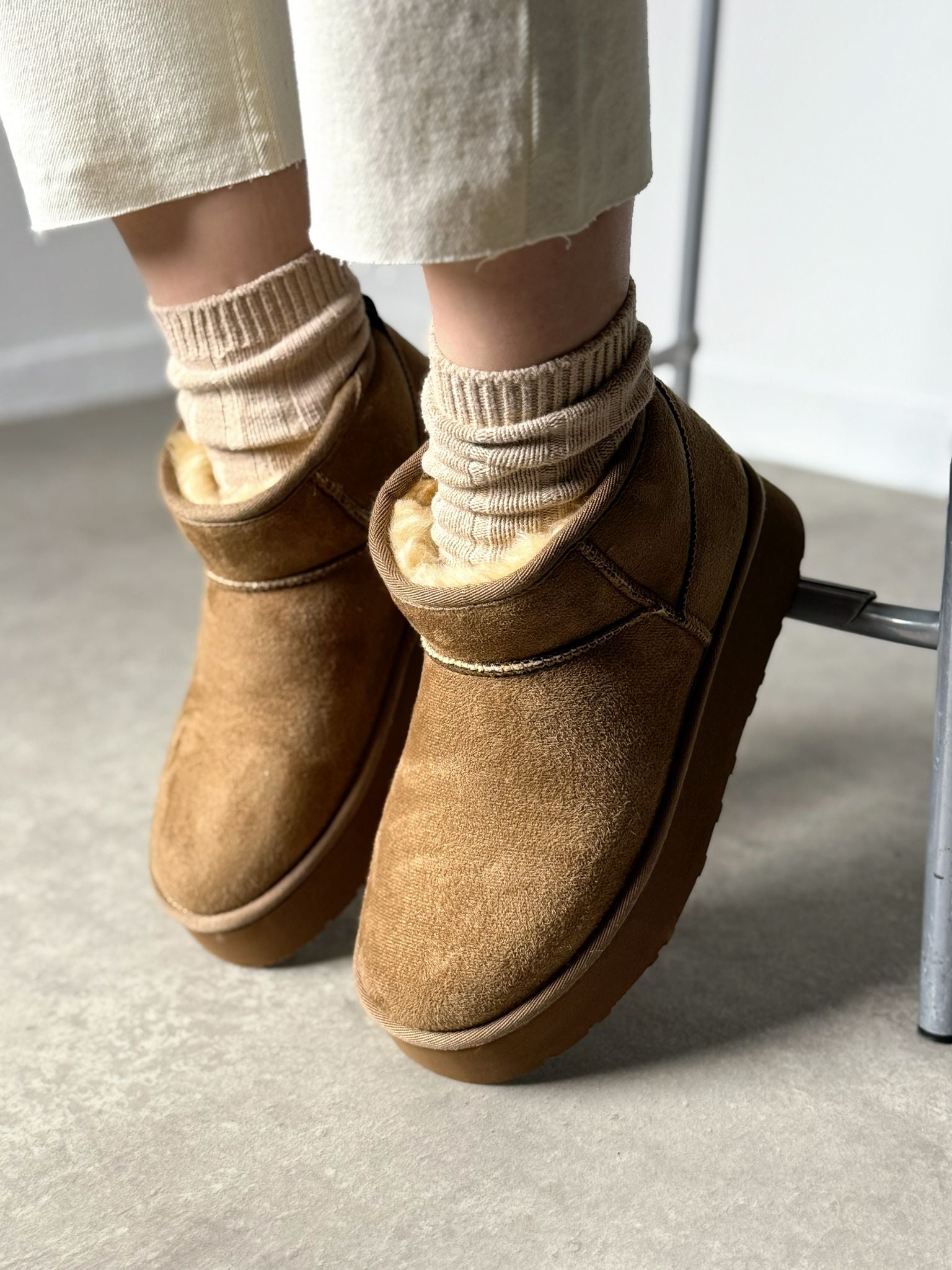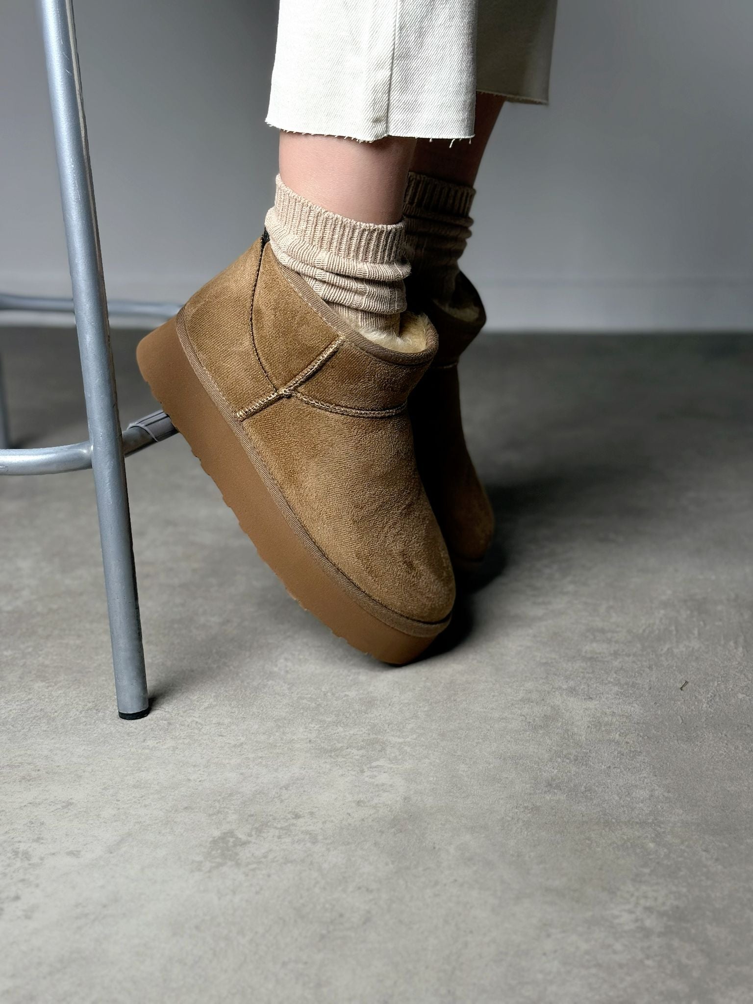 Yumuşacık kürklü iç astarıyla sıcacık tutarken, doğal süet dokusuyla şıklığı tamamlar. Hafif tabanı ve rahat kalıbı sayesinde gün boyu konfor sunar. Şehirde ya da hafta sonu kombinlerinde zahmetsiz bir zarafet sağlar.